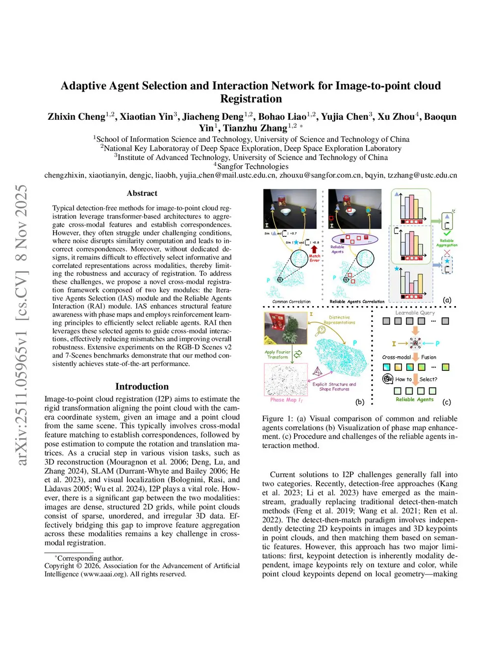 Typical detection-free methods for image-to-point cloud registration leverage transformer-based architectures to aggregate cross-modal features and establish correspondences. However, they often struggle under challenging conditions, where noise disrupts similarity computation and leads to incorrect correspondences. Moreover, without dedicated designs, it remains difficult to effectively select informative and correlated representations across modalities, thereby limiting the robustness and accuracy of registration. To address these challenges, we propose a novel cross-modal registration framework composed of two key modules: the Iterative Agents Selection (IAS) module and the Reliable Agents Interaction (RAI) module. IAS enhances structural feature awareness with phase maps and employs reinforcement learning principles to efficiently select reliable agents. RAI then leverages these selected agents to guide cross-modal interactions, effectively reducing mismatches and improving overall robustness. Extensive experiments on the RGB-D Scenes v2 and 7-Scenes benchmarks demonstrate that our method consistently achieves state-of-the-art performance.