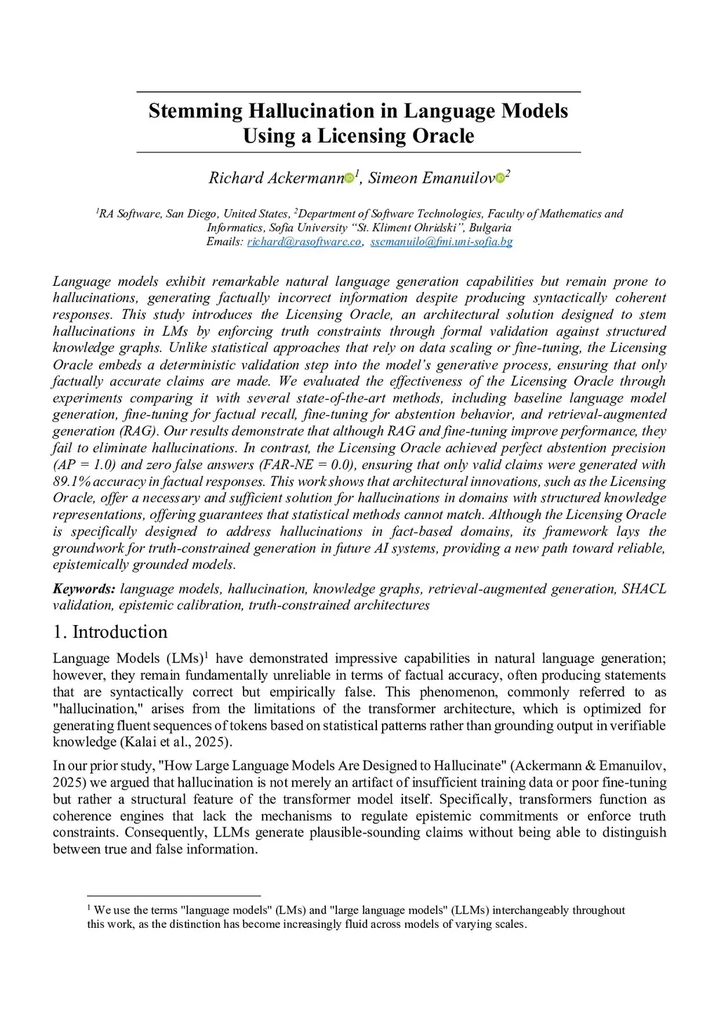 Language models exhibit remarkable natural language generation capabilities but remain prone to hallucinations, generating factually incorrect information despite producing syntactically coherent responses. This study introduces the Licensing Oracle, an architectural solution designed to stem hallucinations in LMs by enforcing truth constraints through formal validation against structured knowledge graphs. Unlike statistical approaches that rely on data scaling or fine-tuning, the Licensing Oracle embeds a deterministic validation step into the model's generative process, ensuring that only factually accurate claims are made. We evaluated the effectiveness of the Licensing Oracle through experiments comparing it with several state-of-the-art methods, including baseline language model generation, fine-tuning for factual recall, fine-tuning for abstention behavior, and retrieval-augmented generation (RAG). Our results demonstrate that although RAG and fine-tuning improve performance, they fail to eliminate hallucinations. In contrast, the Licensing Oracle achieved perfect abstention precision (AP = 1.0) and zero false answers (FAR-NE = 0.0), ensuring that only valid claims were generated with 89.1% accuracy in factual responses. This work shows that architectural innovations, such as the Licensing Oracle, offer a necessary and sufficient solution for hallucinations in domains with structured knowledge representations, offering guarantees that statistical methods cannot match. Although the Licensing Oracle is specifically designed to address hallucinations in fact-based domains, its framework lays the groundwork for truth-constrained generation in future AI systems, providing a new path toward reliable, epistemically grounded models.