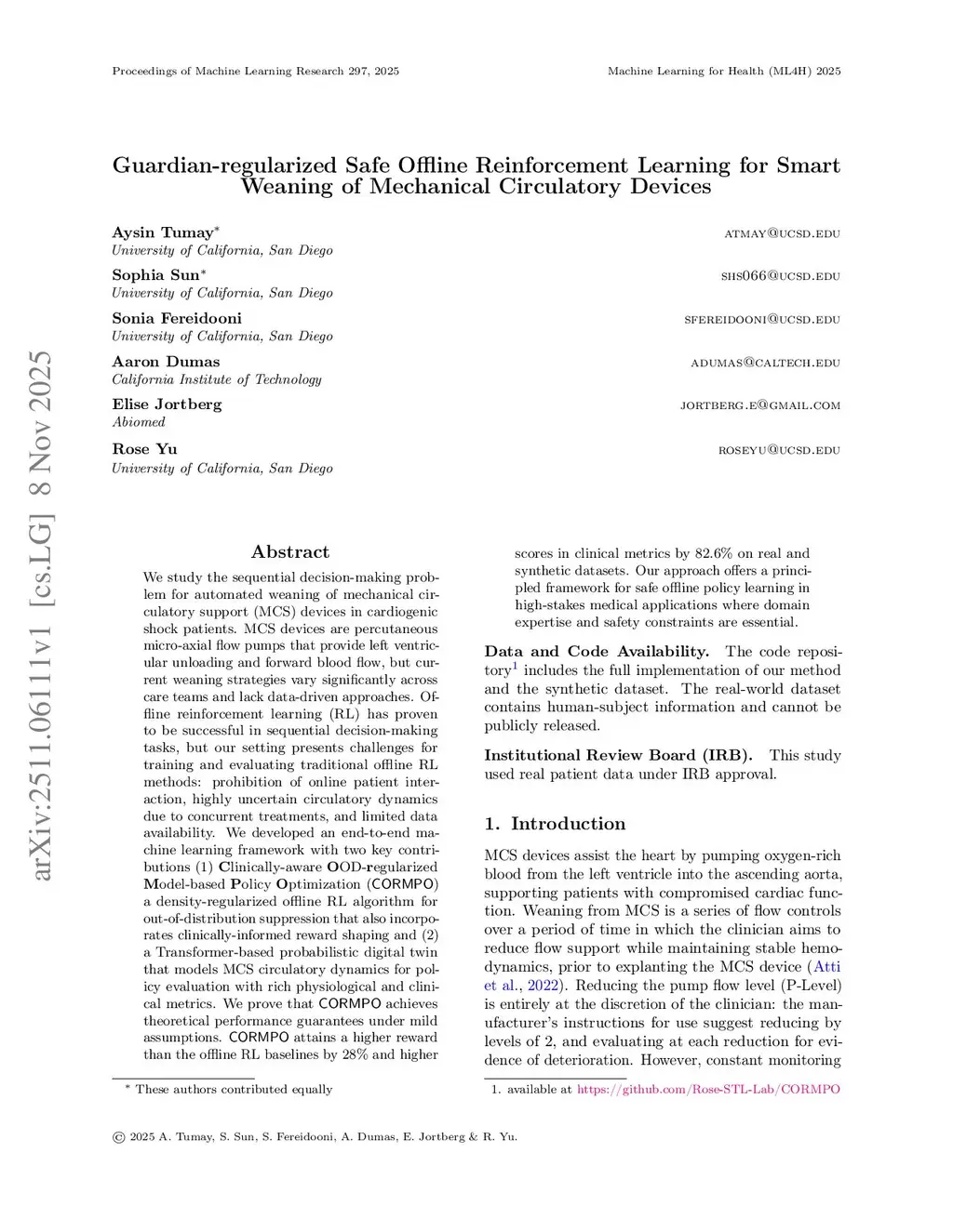We study the sequential decision-making problem for automated weaning of mechanical circulatory support (MCS) devices in cardiogenic shock patients. MCS devices are percutaneous micro-axial flow pumps that provide left ventricular unloading and forward blood flow, but current weaning strategies vary significantly across care teams and lack data-driven approaches. Offline reinforcement learning (RL) has proven to be successful in sequential decision-making tasks, but our setting presents challenges for training and evaluating traditional offline RL methods: prohibition of online patient interaction, highly uncertain circulatory dynamics due to concurrent treatments, and limited data availability. We developed an end-to-end machine learning framework with two key contributions (1) Clinically-aware OOD-regularized Model-based Policy Optimization (CORMPO), a density-regularized offline RL algorithm for out-of-distribution suppression that also incorporates clinically-informed reward shaping and (2) a Transformer-based probabilistic digital twin that models MCS circulatory dynamics for policy evaluation with rich physiological and clinical metrics. We prove that \textsf{CORMPO} achieves theoretical performance guarantees under mild assumptions. CORMPO attains a higher reward than the offline RL baselines by 28% and higher scores in clinical metrics by 82.6% on real and synthetic datasets. Our approach offers a principled framework for safe offline policy learning in high-stakes medical applications where domain expertise and safety constraints are essential.
