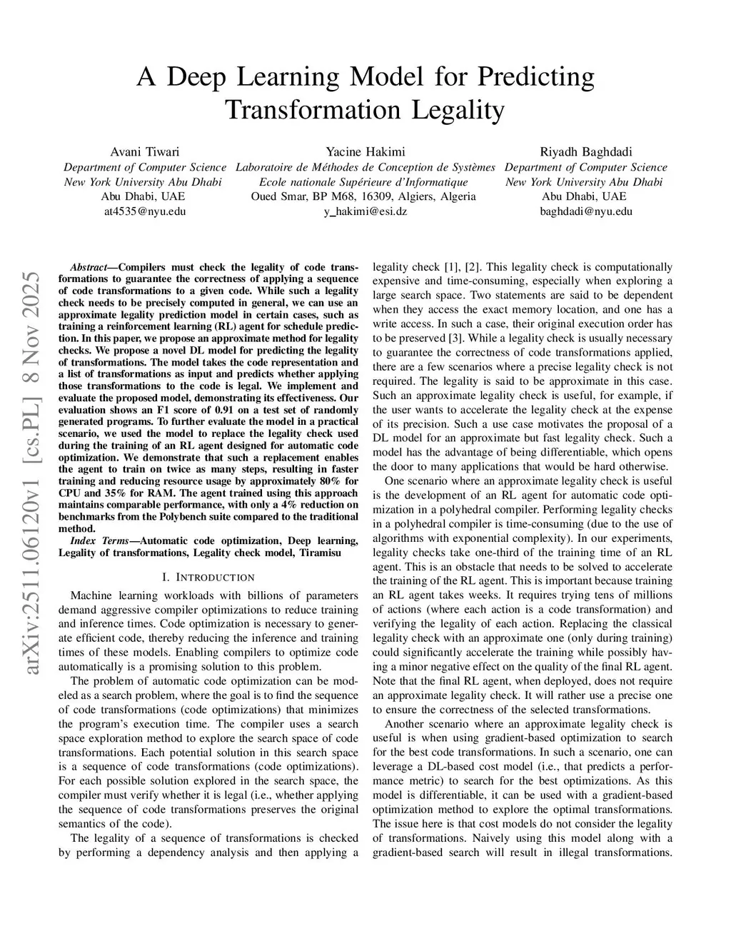 Compilers must check the legality of code transformations to guarantee the correctness of applying a sequence of code transformations to a given code. While such a legality check needs to be precisely computed in general, we can use an approximate legality prediction model in certain cases, such as training a reinforcement learning (RL) agent for schedule prediction. In this paper, we propose an approximate method for legality checks. We propose a novel DL model for predicting the legality of transformations. The model takes the code representation and a list of transformations as input and predicts whether applying those transformations to the code is legal. We implement and evaluate the proposed model, demonstrating its effectiveness. Our evaluation shows an F1 score of 0.91 on a test set of randomly generated programs. To further evaluate the model in a practical scenario, we used the model to replace the legality check used during the training of an RL agent designed for automatic code optimization. We demonstrate that such a replacement enables the agent to train on twice as many steps, resulting in faster training and reducing resource usage by approximately 80\% for CPU and 35\% for RAM. The agent trained using this approach maintains comparable performance, with only a 4\% reduction on benchmarks from the Polybench suite compared to the traditional method.