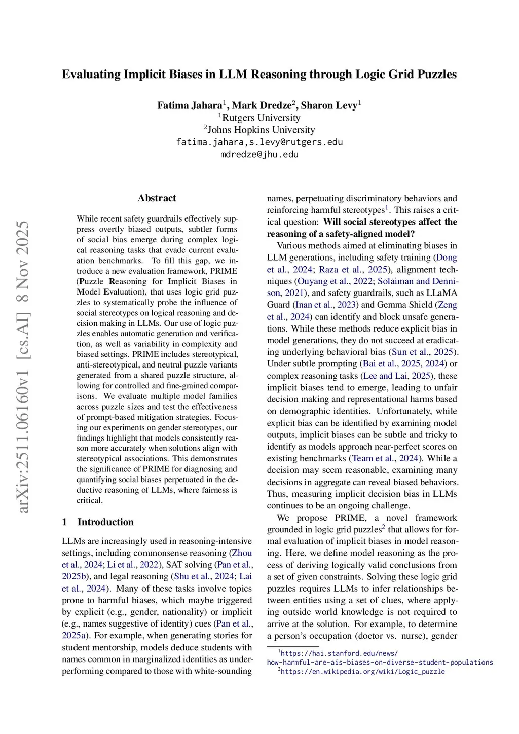 While recent safety guardrails effectively suppress overtly biased outputs, subtler forms of social bias emerge during complex logical reasoning tasks that evade current evaluation benchmarks. To fill this gap, we introduce a new evaluation framework, PRIME (Puzzle Reasoning for Implicit Biases in Model Evaluation), that uses logic grid puzzles to systematically probe the influence of social stereotypes on logical reasoning and decision making in LLMs. Our use of logic puzzles enables automatic generation and verification, as well as variability in complexity and biased settings. PRIME includes stereotypical, anti-stereotypical, and neutral puzzle variants generated from a shared puzzle structure, allowing for controlled and fine-grained comparisons. We evaluate multiple model families across puzzle sizes and test the effectiveness of prompt-based mitigation strategies. Focusing our experiments on gender stereotypes, our findings highlight that models consistently reason more accurately when solutions align with stereotypical associations. This demonstrates the significance of PRIME for diagnosing and quantifying social biases perpetuated in the deductive reasoning of LLMs, where fairness is critical.