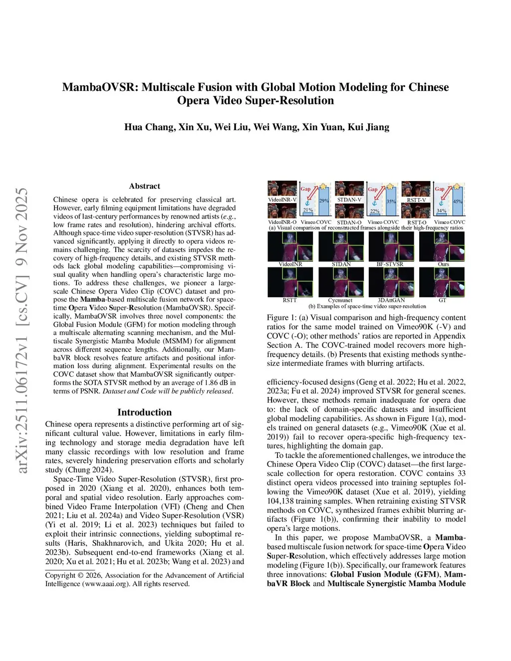 Chinese opera is celebrated for preserving classical art. However, early filming equipment limitations have degraded videos of last-century performances by renowned artists (e.g., low frame rates and resolution), hindering archival efforts. Although space-time video super-resolution (STVSR) has advanced significantly, applying it directly to opera videos remains challenging. The scarcity of datasets impedes the recovery of high frequency details, and existing STVSR methods lack global modeling capabilities, compromising visual quality when handling opera's characteristic large motions. To address these challenges, we pioneer a large scale Chinese Opera Video Clip (COVC) dataset and propose the Mamba-based multiscale fusion network for space-time Opera Video Super-Resolution (MambaOVSR). Specifically, MambaOVSR involves three novel components: the Global Fusion Module (GFM) for motion modeling through a multiscale alternating scanning mechanism, and the Multiscale Synergistic Mamba Module (MSMM) for alignment across different sequence lengths. Additionally, our MambaVR block resolves feature artifacts and positional information loss during alignment. Experimental results on the COVC dataset show that MambaOVSR significantly outperforms the SOTA STVSR method by an average of 1.86 dB in terms of PSNR. Dataset and Code will be publicly released.