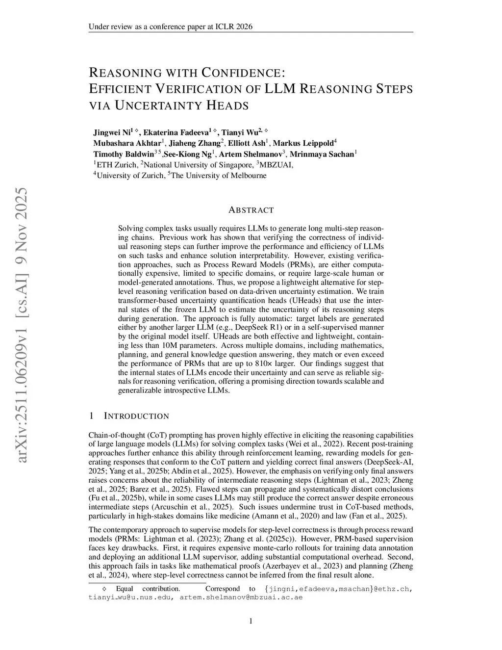 Solving complex tasks usually requires LLMs to generate long multi-step reasoning chains. Previous work has shown that verifying the correctness of individual reasoning steps can further improve the performance and efficiency of LLMs on such tasks and enhance solution interpretability. However, existing verification approaches, such as Process Reward Models (PRMs), are either computationally expensive, limited to specific domains, or require large-scale human or model-generated annotations. Thus, we propose a lightweight alternative for step-level reasoning verification based on data-driven uncertainty scores. We train transformer-based uncertainty quantification heads (UHeads) that use the internal states of a frozen LLM to estimate the uncertainty of its reasoning steps during generation. The approach is fully automatic: target labels are generated either by another larger LLM (e.g., DeepSeek R1) or in a self-supervised manner by the original model itself. UHeads are both effective and lightweight, containing less than 10M parameters. Across multiple domains, including mathematics, planning, and general knowledge question answering, they match or even surpass the performance of PRMs that are up to 810x larger. Our findings suggest that the internal states of LLMs encode their uncertainty and can serve as reliable signals for reasoning verification, offering a promising direction toward scalable and generalizable introspective LLMs.