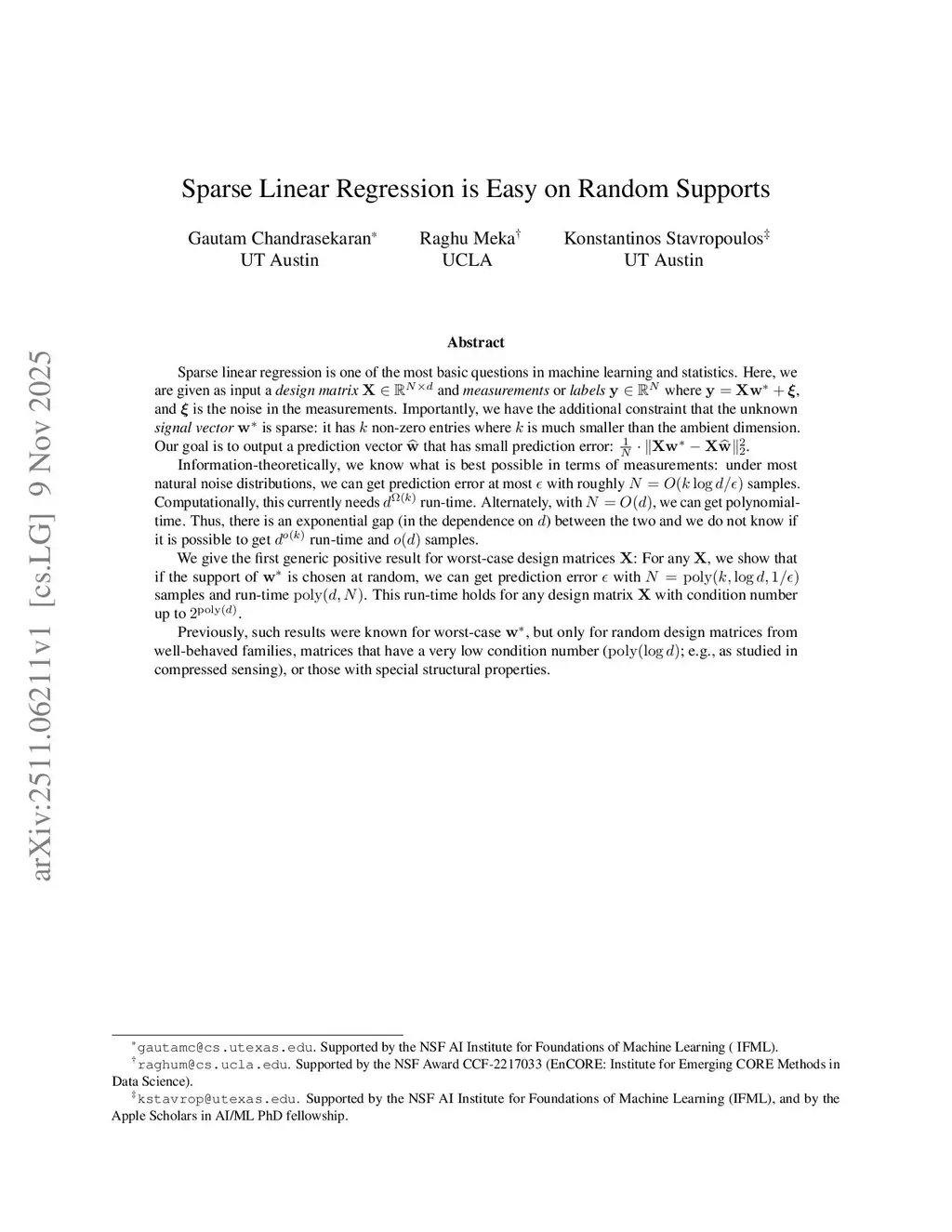 Sparse linear regression is one of the most basic questions in machine learning and statistics. Here, we are given as input a design matrix and measurements or labels where , and is the noise in the measurements. Importantly, we have the additional constraint that the unknown signal vector is sparse: it has non-zero entries where is much smaller than the ambient dimension. Our goal is to output a prediction vector that has small prediction error: .Information-theoretically, we know what is best possible in terms of measurements: under most natural noise distributions, we can get prediction error at most with roughly samples. Computationally, this currently needs run-time. Alternately, with , we can get polynomial-time. Thus, there is an exponential gap (in the dependence on ) between the two and we do not know if it is possible to get run-time and samples.We give the first generic positive result for worst-case design matrices : For any , we show that if the support of is chosen at random, we can get prediction error with samples and run-time . This run-time holds for any design matrix with condition number up to .Previously, such results were known for worst-case , but only for random design matrices from well-behaved families, matrices that have a very low condition number (; e.g., as studied in compressed sensing), or those with special structural properties.