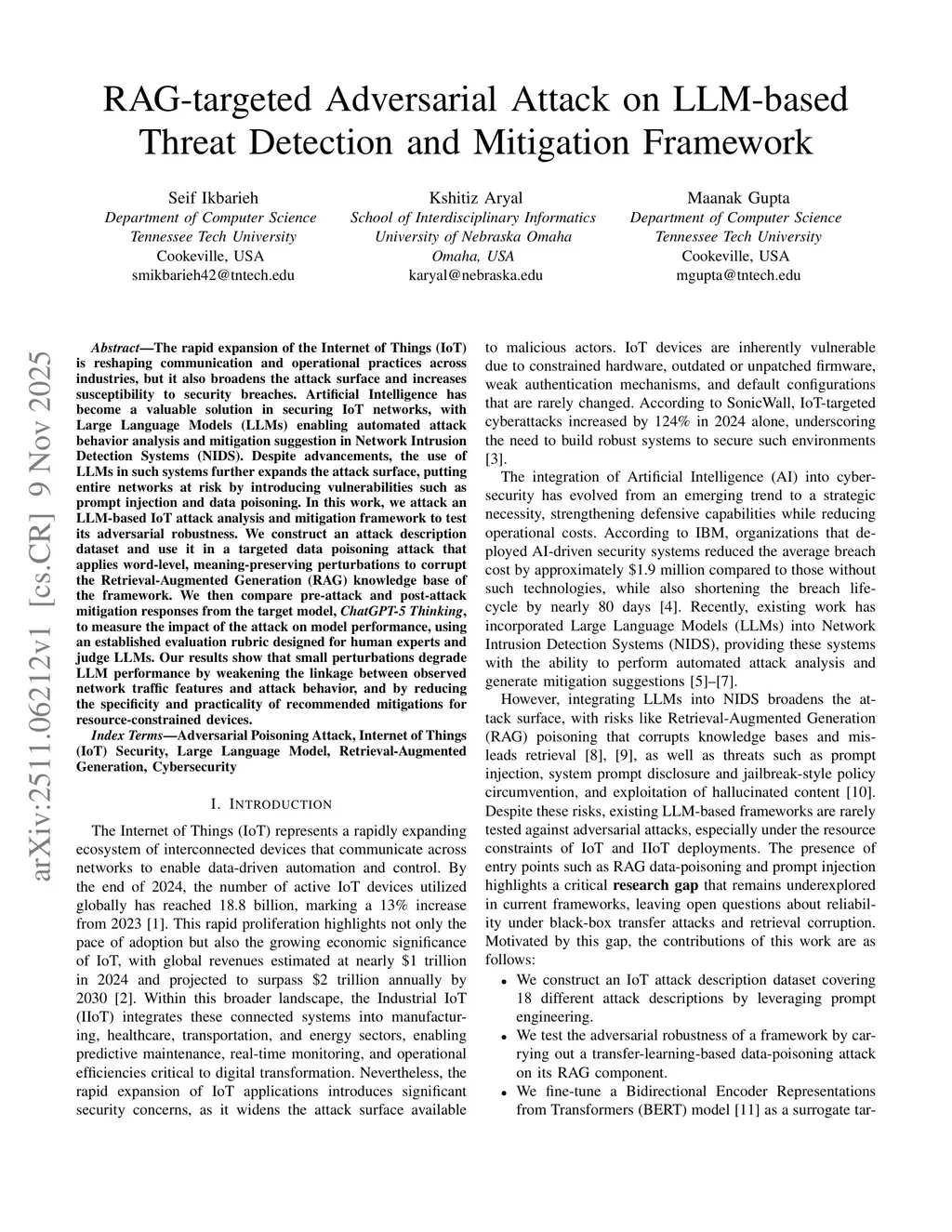 RAG-targeted Adversarial Attack on LLM-based Threat Detection and Mitigation Framework