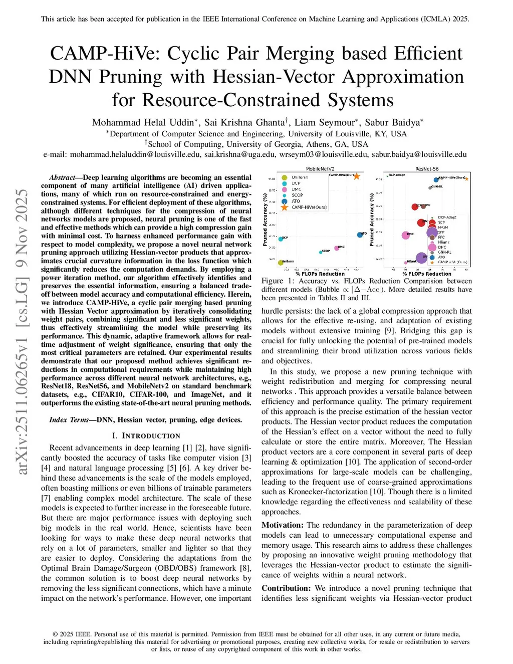 CAMP-HiVe: Cyclic Pair Merging based Efficient DNN Pruning with Hessian-Vector Approximation for Resource-Constrained Systems