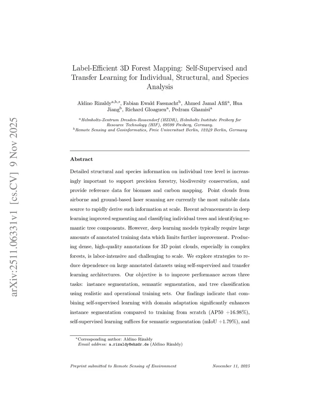 Label-Efficient 3D Forest Mapping: Self-Supervised and Transfer Learning for Individual, Structural, and Species Analysis