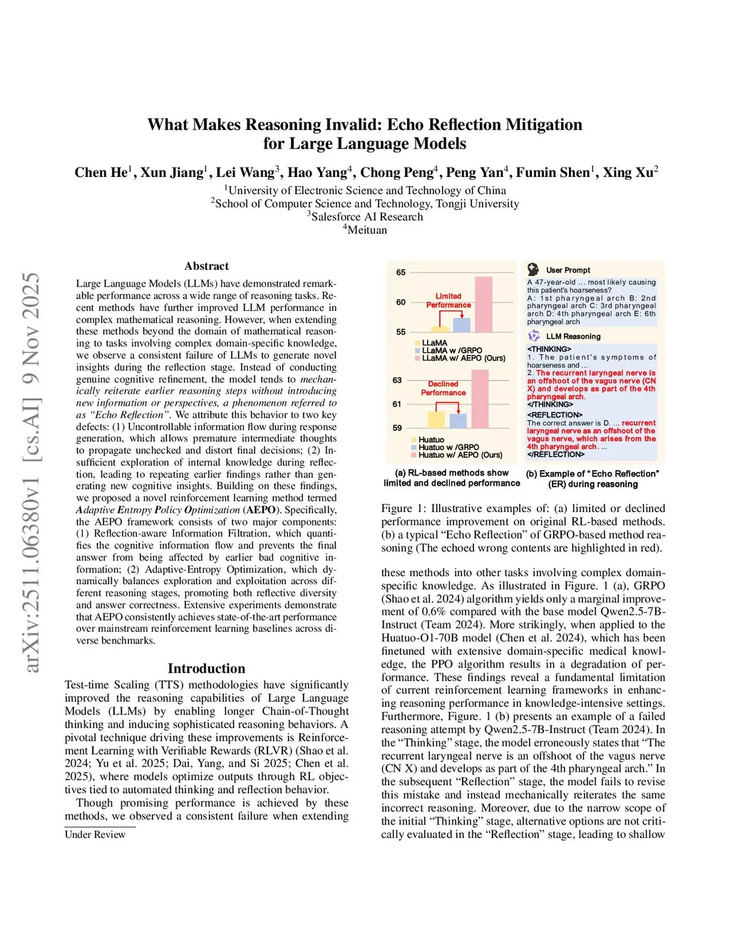 Large Language Models (LLMs) have demonstrated remarkable performance across a wide range of reasoning tasks. Recent methods have further improved LLM performance in complex mathematical reasoning. However, when extending these methods beyond the domain of mathematical reasoning to tasks involving complex domain-specific knowledge, we observe a consistent failure of LLMs to generate novel insights during the reflection stage. Instead of conducting genuine cognitive refinement, the model tends to mechanically reiterate earlier reasoning steps without introducing new information or perspectives, a phenomenon referred to as "Echo Reflection". We attribute this behavior to two key defects: (1) Uncontrollable information flow during response generation, which allows premature intermediate thoughts to propagate unchecked and distort final decisions; (2) Insufficient exploration of internal knowledge during reflection, leading to repeating earlier findings rather than generating new cognitive insights. Building on these findings, we proposed a novel reinforcement learning method termed Adaptive Entropy Policy Optimization (AEPO). Specifically, the AEPO framework consists of two major components: (1) Reflection-aware Information Filtration, which quantifies the cognitive information flow and prevents the final answer from being affected by earlier bad cognitive information; (2) Adaptive-Entropy Optimization, which dynamically balances exploration and exploitation across different reasoning stages, promoting both reflective diversity and answer correctness. Extensive experiments demonstrate that AEPO consistently achieves state-of-the-art performance over mainstream reinforcement learning baselines across diverse benchmarks.