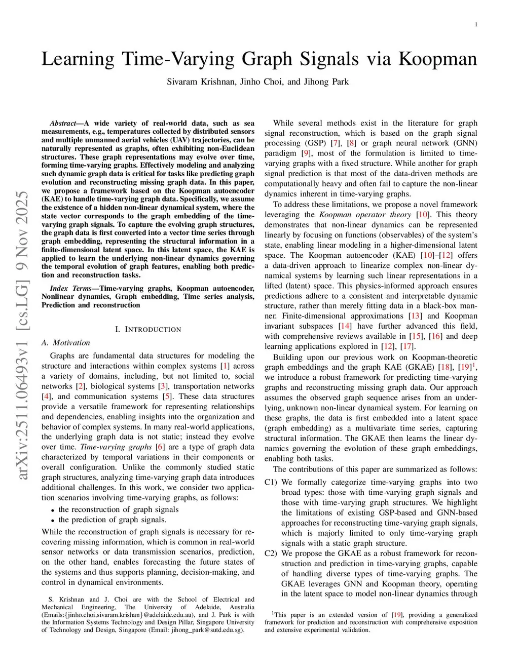 A wide variety of real-world data, such as sea measurements, e.g., temperatures collected by distributed sensors and multiple unmanned aerial vehicles (UAV) trajectories, can be naturally represented as graphs, often exhibiting non-Euclidean structures. These graph representations may evolve over time, forming time-varying graphs. Effectively modeling and analyzing such dynamic graph data is critical for tasks like predicting graph evolution and reconstructing missing graph data. In this paper, we propose a framework based on the Koopman autoencoder (KAE) to handle time-varying graph data. Specifically, we assume the existence of a hidden non-linear dynamical system, where the state vector corresponds to the graph embedding of the time-varying graph signals. To capture the evolving graph structures, the graph data is first converted into a vector time series through graph embedding, representing the structural information in a finite-dimensional latent space. In this latent space, the KAE is applied to learn the underlying non-linear dynamics governing the temporal evolution of graph features, enabling both prediction and reconstruction tasks.