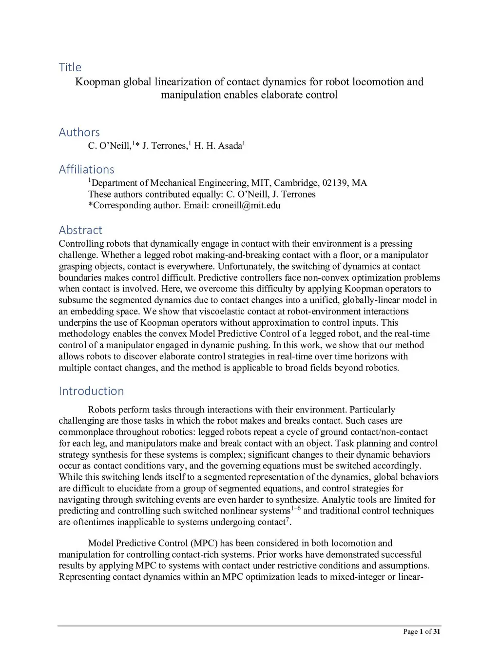 Controlling robots that dynamically engage in contact with their environment is a pressing challenge. Whether a legged robot making-and-breaking contact with a floor, or a manipulator grasping objects, contact is everywhere. Unfortunately, the switching of dynamics at contact boundaries makes control difficult. Predictive controllers face non-convex optimization problems when contact is involved. Here, we overcome this difficulty by applying Koopman operators to subsume the segmented dynamics due to contact changes into a unified, globally-linear model in an embedding space. We show that viscoelastic contact at robot-environment interactions underpins the use of Koopman operators without approximation to control inputs. This methodology enables the convex Model Predictive Control of a legged robot, and the real-time control of a manipulator engaged in dynamic pushing. In this work, we show that our method allows robots to discover elaborate control strategies in real-time over time horizons with multiple contact changes, and the method is applicable to broad fields beyond robotics.