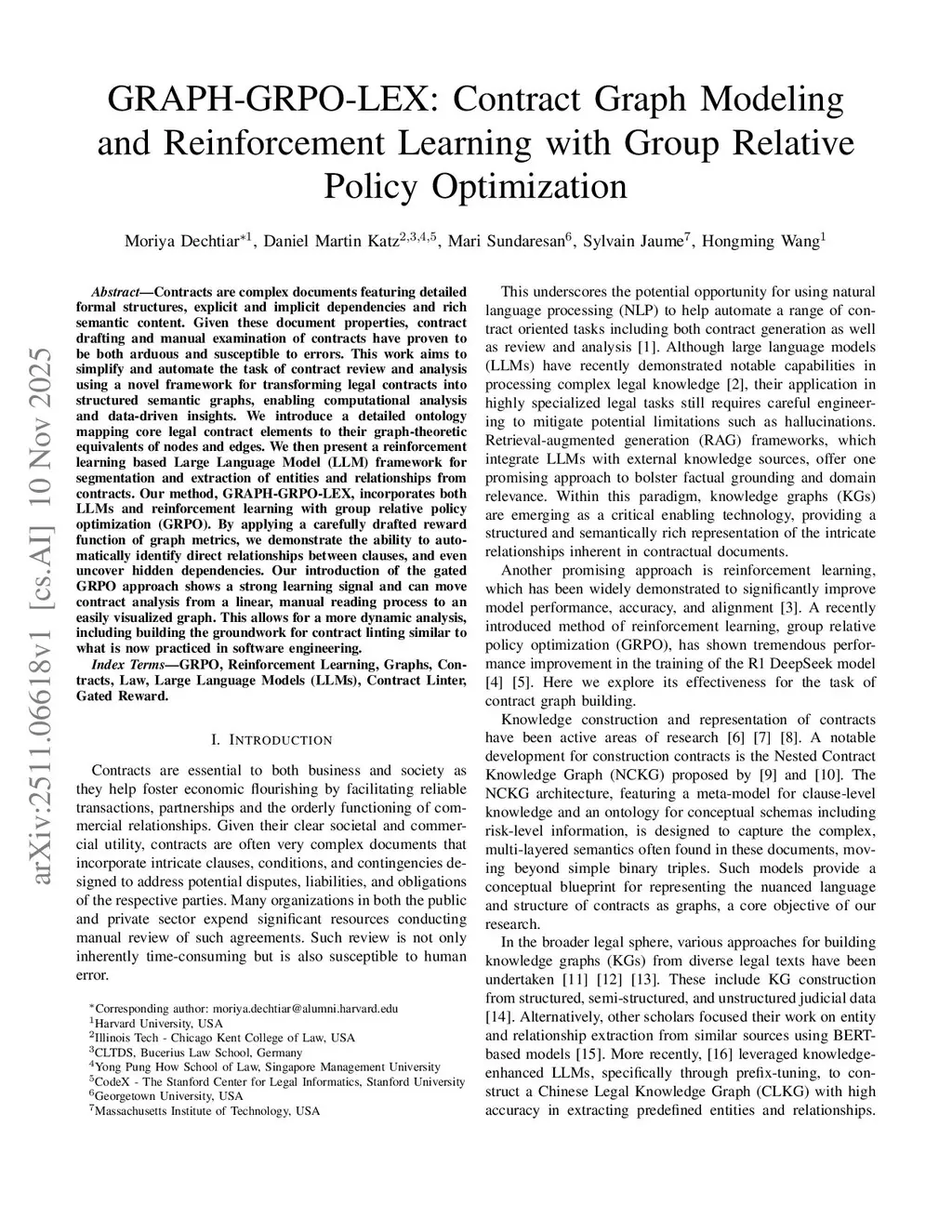 Contracts are complex documents featuring detailed formal structures, explicit and implicit dependencies and rich semantic content. Given these document properties, contract drafting and manual examination of contracts have proven to be both arduous and susceptible to errors. This work aims to simplify and automate the task of contract review and analysis using a novel framework for transforming legal contracts into structured semantic graphs, enabling computational analysis and data-driven insights. We introduce a detailed ontology mapping core legal contract elements to their graph-theoretic equivalents of nodes and edges. We then present a reinforcement learning based Large Language Model (LLM) framework for segmentation and extraction of entities and relationships from contracts. Our method, GRAPH-GRPO-LEX, incorporates both LLMs and reinforcement learning with group relative policy optimization (GRPO). By applying a carefully drafted reward function of graph metrics, we demonstrate the ability to automatically identify direct relationships between clauses, and even uncover hidden dependencies. Our introduction of the gated GRPO approach shows a strong learning signal and can move contract analysis from a linear, manual reading process to an easily visualized graph. This allows for a more dynamic analysis, including building the groundwork for contract linting similar to what is now practiced in software engineering.