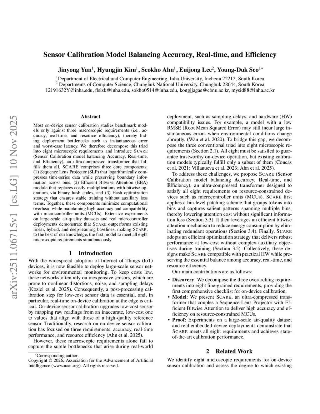 Most on-device sensor calibration studies benchmark models only against three macroscopic requirements (i.e., accuracy, real-time, and resource efficiency), thereby hiding deployment bottlenecks such as instantaneous error and worst-case latency. We therefore decompose this triad into eight microscopic requirements and introduce Scare (Sensor Calibration model balancing Accuracy, Real-time, and Efficiency), an ultra-compressed transformer that fulfills them all. SCARE comprises three core components: (1) Sequence Lens Projector (SLP) that logarithmically compresses time-series data while preserving boundary information across bins, (2) Efficient Bitwise Attention (EBA) module that replaces costly multiplications with bitwise operations via binary hash codes, and (3) Hash optimization strategy that ensures stable training without auxiliary loss terms. Together, these components minimize computational overhead while maintaining high accuracy and compatibility with microcontroller units (MCUs). Extensive experiments on large-scale air-quality datasets and real microcontroller deployments demonstrate that Scare outperforms existing linear, hybrid, and deep-learning baselines, making Scare, to the best of our knowledge, the first model to meet all eight microscopic requirements simultaneously.