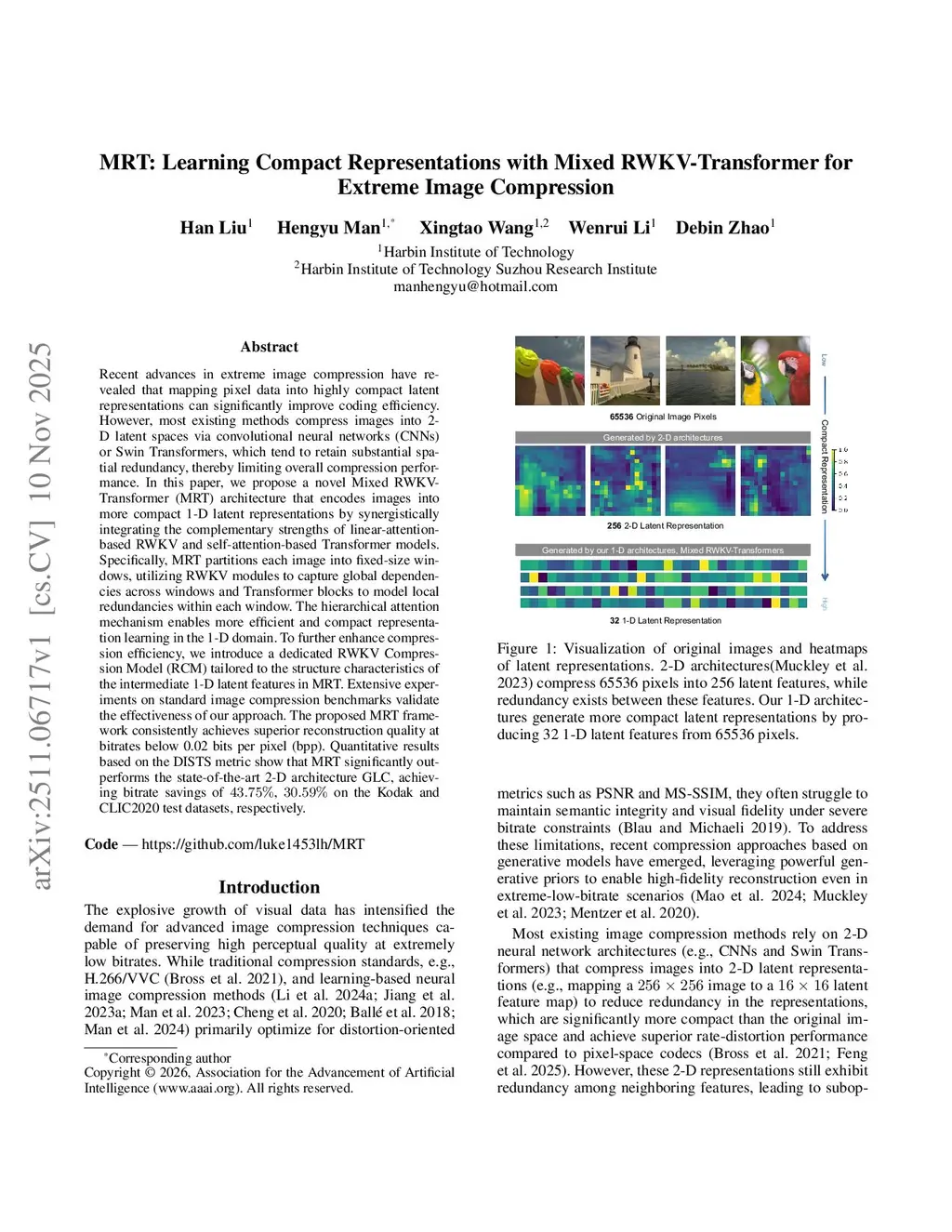Recent advances in extreme image compression have revealed that mapping pixel data into highly compact latent representations can significantly improve coding efficiency. However, most existing methods compress images into 2-D latent spaces via convolutional neural networks (CNNs) or Swin Transformers, which tend to retain substantial spatial redundancy, thereby limiting overall compression performance. In this paper, we propose a novel Mixed RWKV-Transformer (MRT) architecture that encodes images into more compact 1-D latent representations by synergistically integrating the complementary strengths of linear-attention-based RWKV and self-attention-based Transformer models. Specifically, MRT partitions each image into fixed-size windows, utilizing RWKV modules to capture global dependencies across windows and Transformer blocks to model local redundancies within each window. The hierarchical attention mechanism enables more efficient and compact representation learning in the 1-D domain. To further enhance compression efficiency, we introduce a dedicated RWKV Compression Model (RCM) tailored to the structure characteristics of the intermediate 1-D latent features in MRT. Extensive experiments on standard image compression benchmarks validate the effectiveness of our approach. The proposed MRT framework consistently achieves superior reconstruction quality at bitrates below 0.02 bits per pixel (bpp). Quantitative results based on the DISTS metric show that MRT significantly outperforms the state-of-the-art 2-D architecture GLC, achieving bitrate savings of 43.75%, 30.59% on the Kodak and CLIC2020 test datasets, respectively.