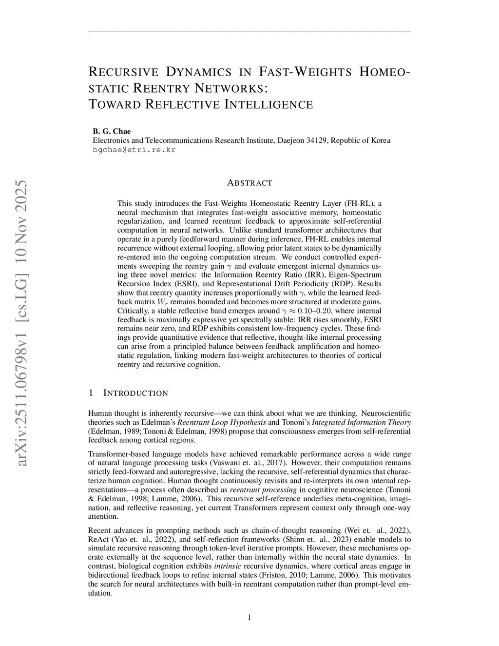 This study introduces the Fast-Weights Homeostatic Reentry Layer (FH-RL), a neural mechanism that integrates fast-weight associative memory, homeostatic regularization, and learned reentrant feedback to approximate self-referential computation in neural networks. Unlike standard transformer architectures that operate in a purely feedforward manner during inference, FH-RL enables internal recurrence without external looping, allowing prior latent states to be dynamically re-entered into the ongoing computation stream. We conduct controlled experiments sweeping the reentry gain and evaluate emergent internal dynamics using three novel metrics: the Information Reentry Ratio (IRR), Eigen-Spectrum Recursion Index (ESRI), and Representational Drift Periodicity (RDP). Results show that reentry quantity increases proportionally with~, while the learned feedback matrix remains bounded and becomes more structured at moderate gains. Critically, a stable reflective band emerges around , where internal feedback is maximally expressive yet spectrally stable: IRR rises smoothly, ESRI remains near zero, and RDP exhibits consistent low-frequency cycles. These findings provide quantitative evidence that reflective, thought-like internal processing can arise from a principled balance between feedback amplification and homeostatic regulation, linking modern fast-weight architectures to theories of cortical reentry and recursive cognition.