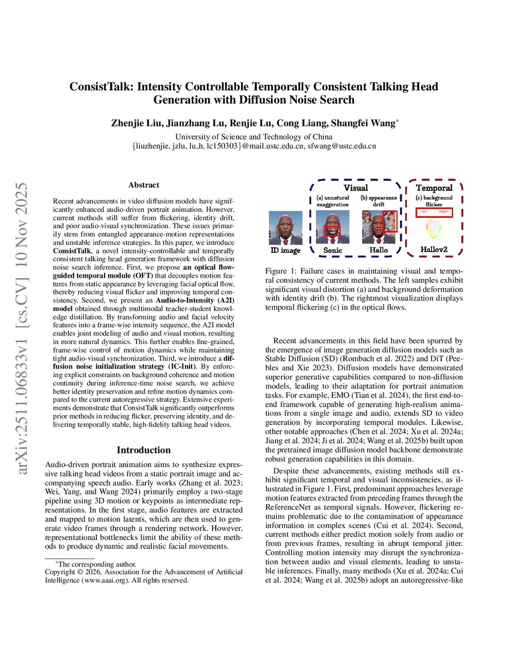 Recent advancements in video diffusion models have significantly enhanced audio-driven portrait animation. However, current methods still suffer from flickering, identity drift, and poor audio-visual synchronization. These issues primarily stem from entangled appearance-motion representations and unstable inference strategies. In this paper, we introduce \textbf{ConsistTalk}, a novel intensity-controllable and temporally consistent talking head generation framework with diffusion noise search inference. First, we propose \textbf{an optical flow-guided temporal module (OFT)} that decouples motion features from static appearance by leveraging facial optical flow, thereby reducing visual flicker and improving temporal consistency. Second, we present an \textbf{Audio-to-Intensity (A2I) model} obtained through multimodal teacher-student knowledge distillation. By transforming audio and facial velocity features into a frame-wise intensity sequence, the A2I model enables joint modeling of audio and visual motion, resulting in more natural dynamics. This further enables fine-grained, frame-wise control of motion dynamics while maintaining tight audio-visual synchronization. Third, we introduce a \textbf{diffusion noise initialization strategy (IC-Init)}. By enforcing explicit constraints on background coherence and motion continuity during inference-time noise search, we achieve better identity preservation and refine motion dynamics compared to the current autoregressive strategy. Extensive experiments demonstrate that ConsistTalk significantly outperforms prior methods in reducing flicker, preserving identity, and delivering temporally stable, high-fidelity talking head videos.