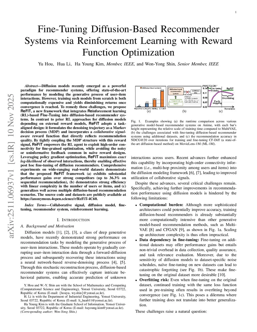 Diffusion models recently emerged as a powerful paradigm for recommender systems, offering state-of-the-art performance by modeling the generative process of user-item interactions. However, training such models from scratch is both computationally expensive and yields diminishing returns once convergence is reached. To remedy these challenges, we propose ReFiT, a new framework that integrates Reinforcement learning (RL)-based Fine-Tuning into diffusion-based recommender systems. In contrast to prior RL approaches for diffusion models depending on external reward models, ReFiT adopts a task-aligned design: it formulates the denoising trajectory as a Markov decision process (MDP) and incorporates a collaborative signal-aware reward function that directly reflects recommendation quality. By tightly coupling the MDP structure with this reward signal, ReFiT empowers the RL agent to exploit high-order connectivity for fine-grained optimization, while avoiding the noisy or uninformative feedback common in naive reward designs. Leveraging policy gradient optimization, ReFiT maximizes exact log-likelihood of observed interactions, thereby enabling effective post hoc fine-tuning of diffusion recommenders. Comprehensive experiments on wide-ranging real-world datasets demonstrate that the proposed ReFiT framework (a) exhibits substantial performance gains over strong competitors (up to 36.3% on sequential recommendation), (b) demonstrates strong efficiency with linear complexity in the number of users or items, and (c) generalizes well across multiple diffusion-based recommendation scenarios. The source code and datasets are publicly available atthis https URL.
