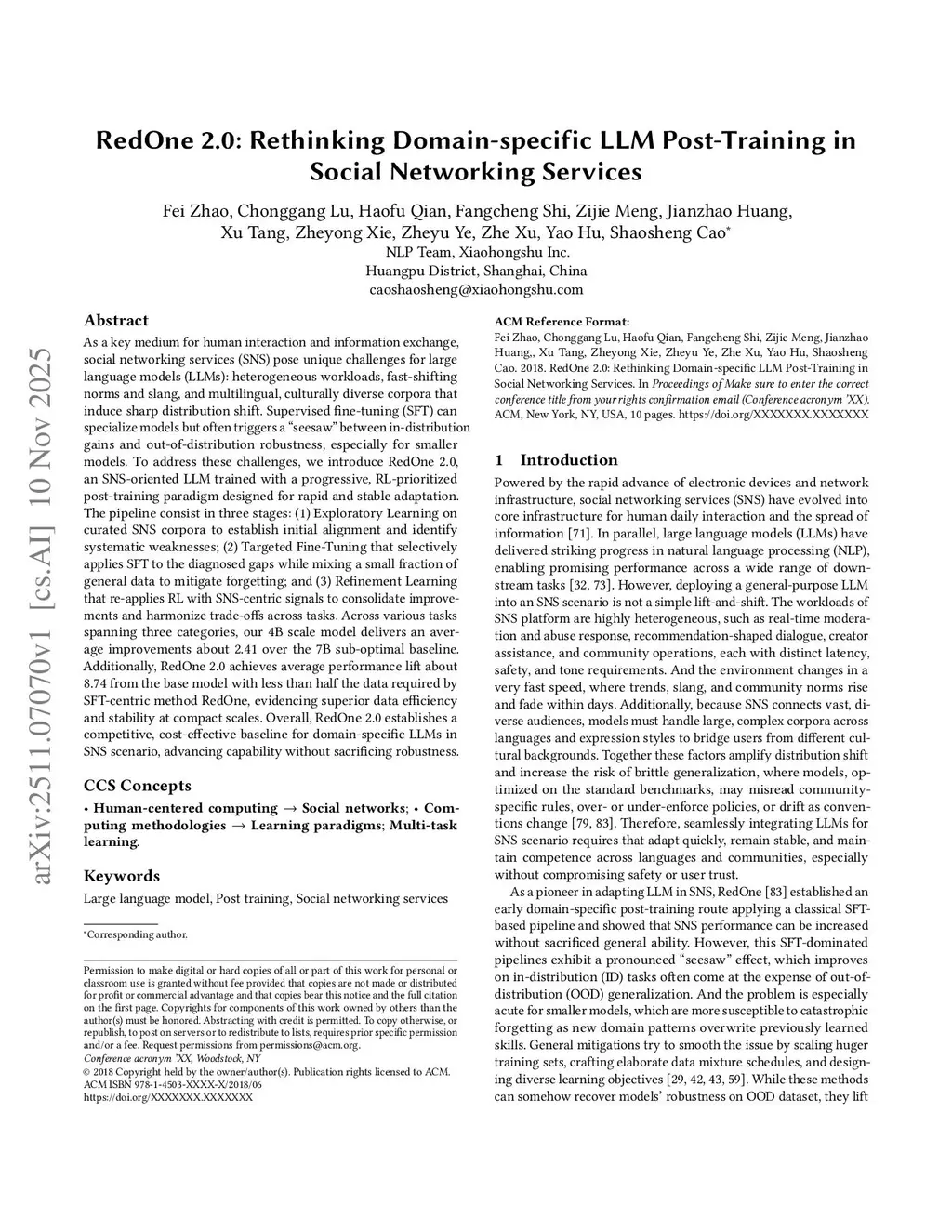 As a key medium for human interaction and information exchange, social networking services (SNS) pose unique challenges for large language models (LLMs): heterogeneous workloads, fast-shifting norms and slang, and multilingual, culturally diverse corpora that induce sharp distribution shift. Supervised fine-tuning (SFT) can specialize models but often triggers a ``seesaw'' between in-distribution gains and out-of-distribution robustness, especially for smaller models. To address these challenges, we introduce RedOne 2.0, an SNS-oriented LLM trained with a progressive, RL-prioritized post-training paradigm designed for rapid and stable adaptation. The pipeline consist in three stages: (1) Exploratory Learning on curated SNS corpora to establish initial alignment and identify systematic weaknesses; (2) Targeted Fine-Tuning that selectively applies SFT to the diagnosed gaps while mixing a small fraction of general data to mitigate forgetting; and (3) Refinement Learning that re-applies RL with SNS-centric signals to consolidate improvements and harmonize trade-offs across tasks. Across various tasks spanning three categories, our 4B scale model delivers an average improvements about 2.41 over the 7B sub-optimal baseline. Additionally, RedOne 2.0 achieves average performance lift about 8.74 from the base model with less than half the data required by SFT-centric method RedOne, evidencing superior data efficiency and stability at compact scales. Overall, RedOne 2.0 establishes a competitive, cost-effective baseline for domain-specific LLMs in SNS scenario, advancing capability without sacrificing robustness.