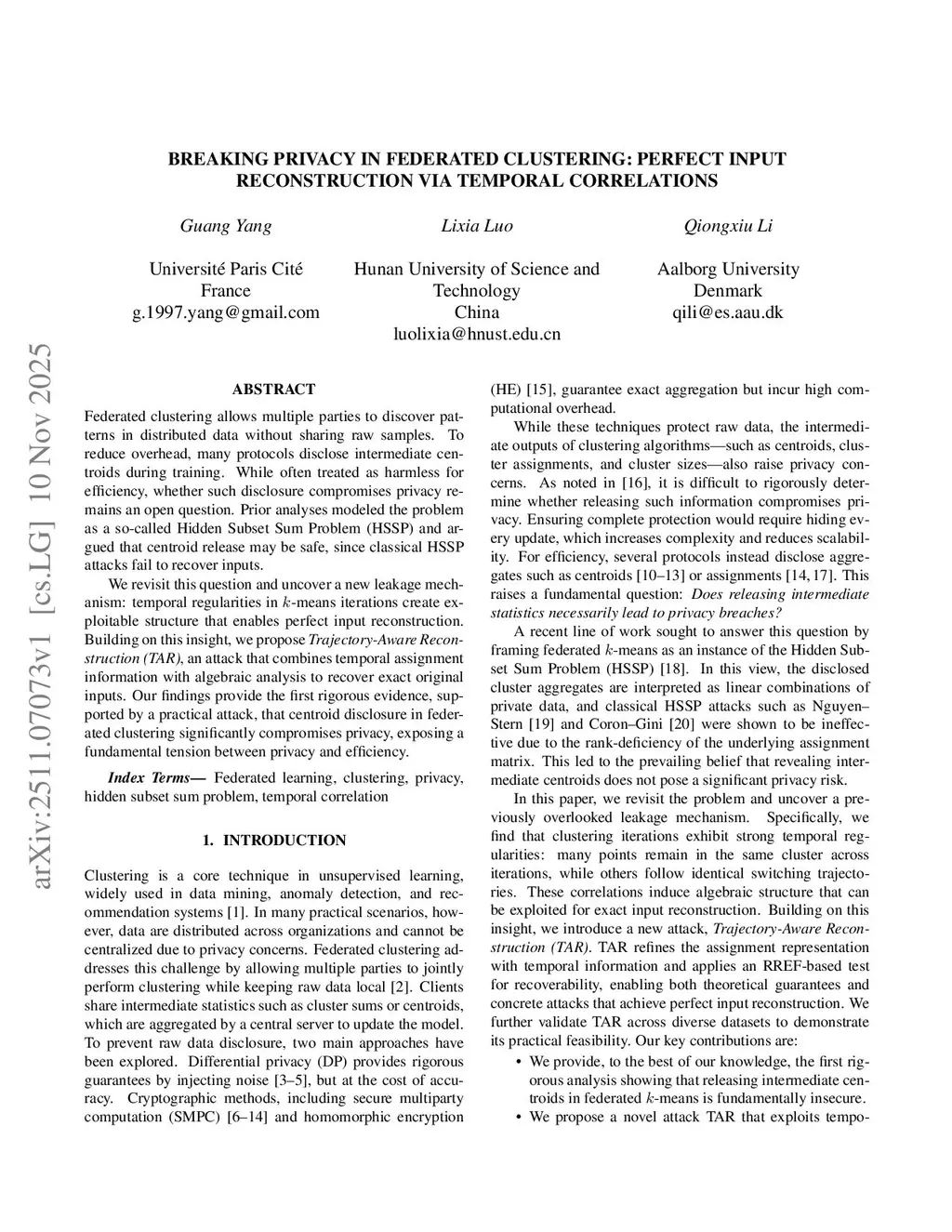 Federated clustering allows multiple parties to discover patterns in distributed data without sharing raw samples. To reduce overhead, many protocols disclose intermediate centroids during training. While often treated as harmless for efficiency, whether such disclosure compromises privacy remains an open question. Prior analyses modeled the problem as a so-called Hidden Subset Sum Problem (HSSP) and argued that centroid release may be safe, since classical HSSP attacks fail to recover inputs.We revisit this question and uncover a new leakage mechanism: temporal regularities in -means iterations create exploitable structure that enables perfect input reconstruction. Building on this insight, we propose Trajectory-Aware Reconstruction (TAR), an attack that combines temporal assignment information with algebraic analysis to recover exact original inputs. Our findings provide the first rigorous evidence, supported by a practical attack, that centroid disclosure in federated clustering significantly compromises privacy, exposing a fundamental tension between privacy and efficiency.