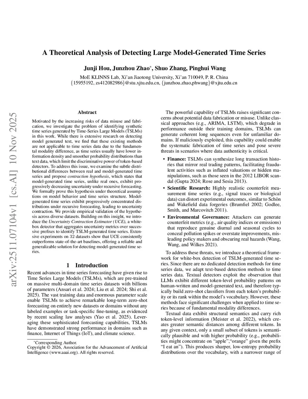 Motivated by the increasing risks of data misuse and fabrication, we investigate the problem of identifying synthetic time series generated by Time-Series Large Models (TSLMs) in this work. While there are extensive researches on detecting model generated text, we find that these existing methods are not applicable to time series data due to the fundamental modality difference, as time series usually have lower information density and smoother probability distributions than text data, which limit the discriminative power of token-based detectors. To address this issue, we examine the subtle distributional differences between real and model-generated time series and propose the contraction hypothesis, which states that model-generated time series, unlike real ones, exhibit progressively decreasing uncertainty under recursive forecasting. We formally prove this hypothesis under theoretical assumptions on model behavior and time series structure. Model-generated time series exhibit progressively concentrated distributions under recursive forecasting, leading to uncertainty contraction. We provide empirical validation of the hypothesis across diverse datasets. Building on this insight, we introduce the Uncertainty Contraction Estimator (UCE), a white-box detector that aggregates uncertainty metrics over successive prefixes to identify TSLM-generated time series. Extensive experiments on 32 datasets show that UCE consistently outperforms state-of-the-art baselines, offering a reliable and generalizable solution for detecting model-generated time series.