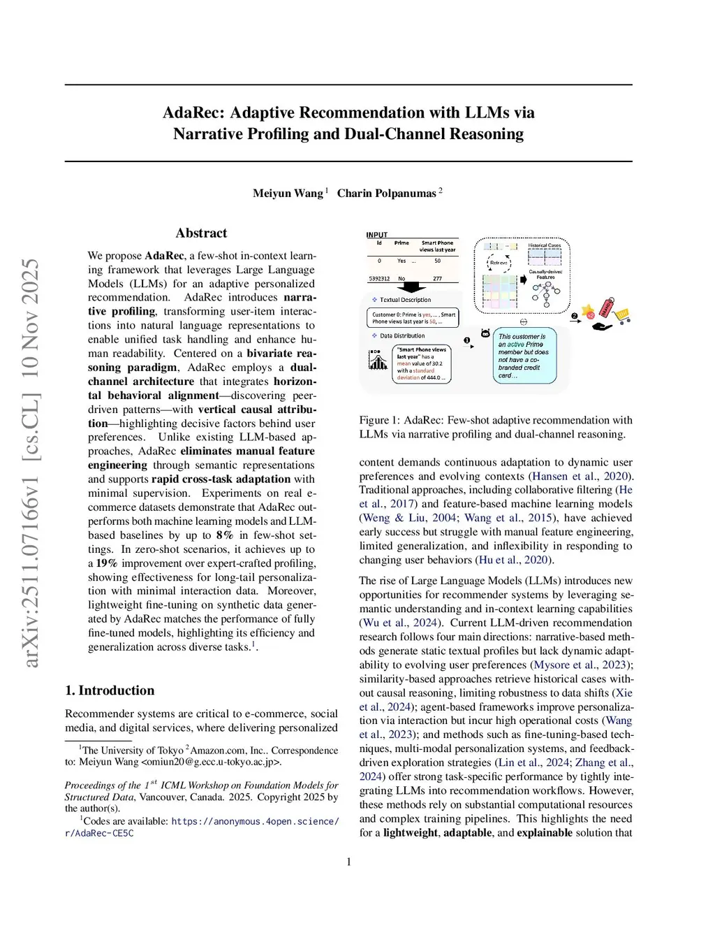 We propose AdaRec, a few-shot in-context learning framework that leverages large language models for an adaptive personalized recommendation. AdaRec introduces narrative profiling, transforming user-item interactions into natural language representations to enable unified task handling and enhance human readability. Centered on a bivariate reasoning paradigm, AdaRec employs a dual-channel architecture that integrates horizontal behavioral alignment, discovering peer-driven patterns, with vertical causal attribution, highlighting decisive factors behind user preferences. Unlike existing LLM-based approaches, AdaRec eliminates manual feature engineering through semantic representations and supports rapid cross-task adaptation with minimal supervision. Experiments on real ecommerce datasets demonstrate that AdaRec outperforms both machine learning models and LLM-based baselines by up to eight percent in few-shot settings. In zero-shot scenarios, it achieves up to a nineteen percent improvement over expert-crafted profiling, showing effectiveness for long-tail personalization with minimal interaction data. Furthermore, lightweight fine-tuning on synthetic data generated by AdaRec matches the performance of fully fine-tuned models, highlighting its efficiency and generalization across diverse tasks.