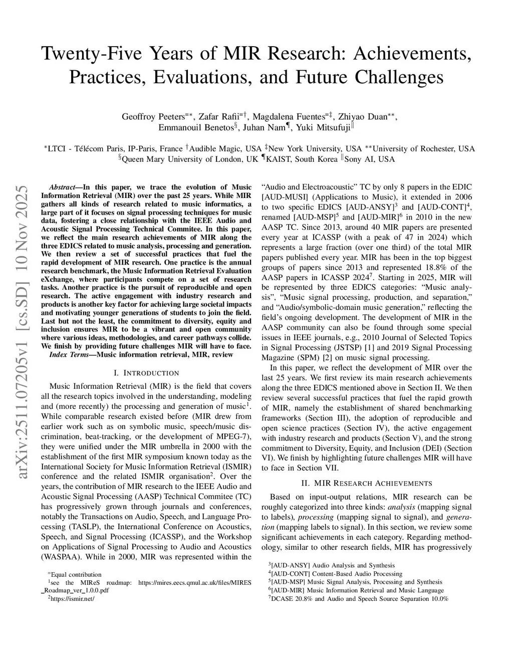 In this paper, we trace the evolution of Music Information Retrieval (MIR) over the past 25 years. While MIR gathers all kinds of research related to music informatics, a large part of it focuses on signal processing techniques for music data, fostering a close relationship with the IEEE Audio and Acoustic Signal Processing Technical Commitee. In this paper, we reflect the main research achievements of MIR along the three EDICS related to music analysis, processing and generation. We then review a set of successful practices that fuel the rapid development of MIR research. One practice is the annual research benchmark, the Music Information Retrieval Evaluation eXchange, where participants compete on a set of research tasks. Another practice is the pursuit of reproducible and open research. The active engagement with industry research and products is another key factor for achieving large societal impacts and motivating younger generations of students to join the field. Last but not the least, the commitment to diversity, equity and inclusion ensures MIR to be a vibrant and open community where various ideas, methodologies, and career pathways collide. We finish by providing future challenges MIR will have to face.