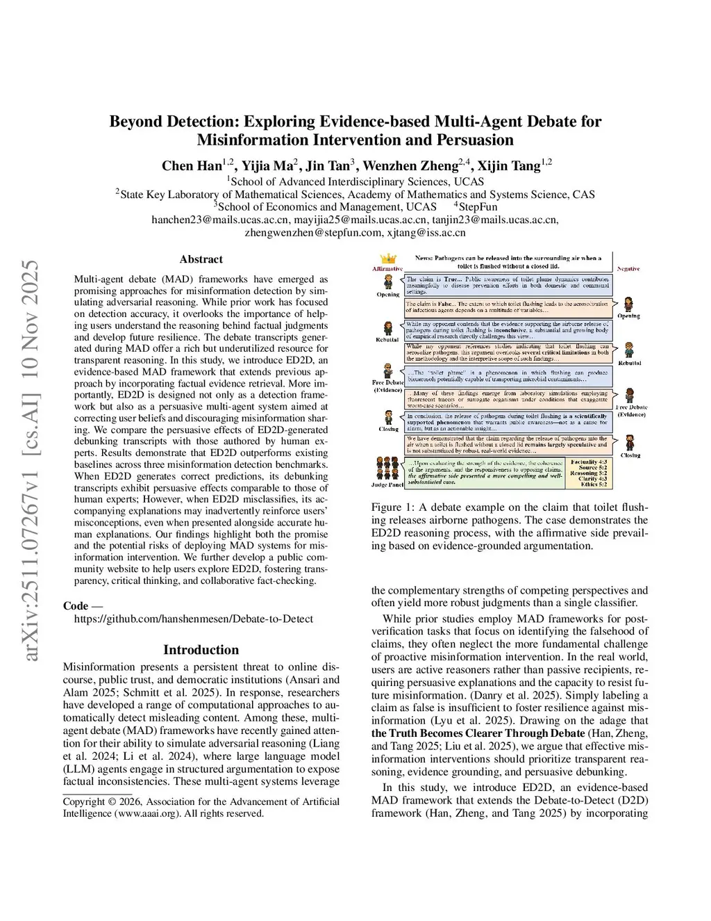 Multi-agent debate (MAD) frameworks have emerged as promising approaches for misinformation detection by simulating adversarial reasoning. While prior work has focused on detection accuracy, it overlooks the importance of helping users understand the reasoning behind factual judgments and develop future resilience. The debate transcripts generated during MAD offer a rich but underutilized resource for transparent reasoning. In this study, we introduce ED2D, an evidence-based MAD framework that extends previous approach by incorporating factual evidence retrieval. More importantly, ED2D is designed not only as a detection framework but also as a persuasive multi-agent system aimed at correcting user beliefs and discouraging misinformation sharing. We compare the persuasive effects of ED2D-generated debunking transcripts with those authored by human experts. Results demonstrate that ED2D outperforms existing baselines across three misinformation detection benchmarks. When ED2D generates correct predictions, its debunking transcripts exhibit persuasive effects comparable to those of human experts; However, when ED2D misclassifies, its accompanying explanations may inadvertently reinforce users'misconceptions, even when presented alongside accurate human explanations. Our findings highlight both the promise and the potential risks of deploying MAD systems for misinformation intervention. We further develop a public community website to help users explore ED2D, fostering transparency, critical thinking, and collaborative fact-checking.