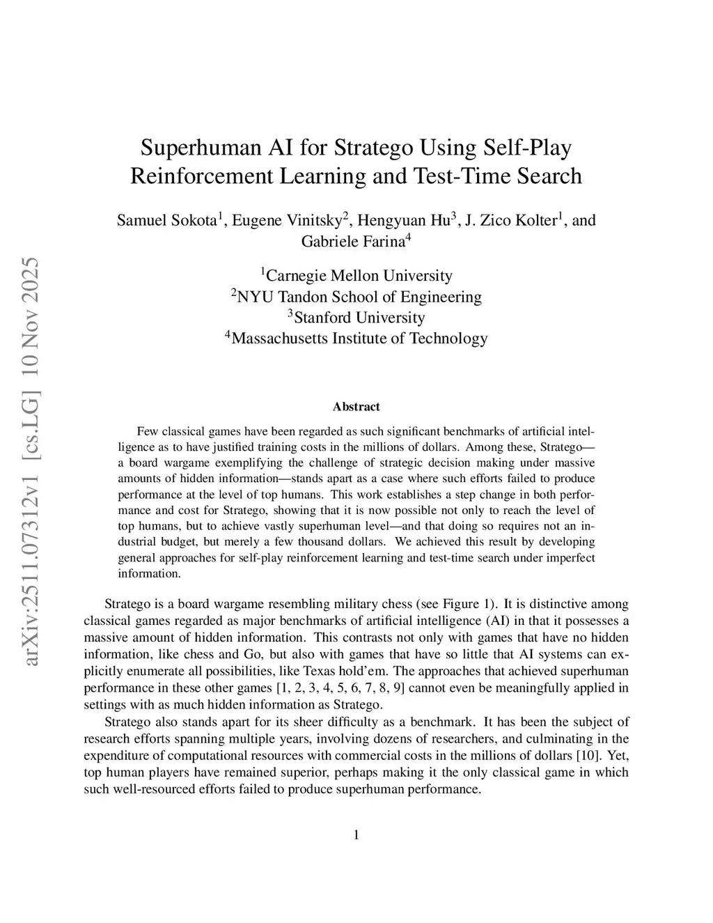 Few classical games have been regarded as such significant benchmarks of artificial intelligence as to have justified training costs in the millions of dollars. Among these, Stratego -- a board wargame exemplifying the challenge of strategic decision making under massive amounts of hidden information -- stands apart as a case where such efforts failed to produce performance at the level of top humans. This work establishes a step change in both performance and cost for Stratego, showing that it is now possible not only to reach the level of top humans, but to achieve vastly superhuman level -- and that doing so requires not an industrial budget, but merely a few thousand dollars. We achieved this result by developing general approaches for self-play reinforcement learning and test-time search under imperfect information.