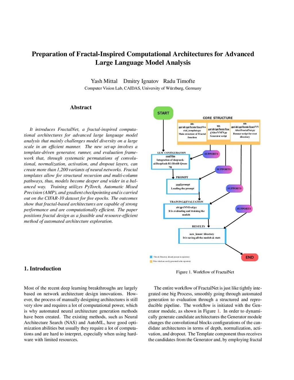 It introduces FractalNet, a fractal-inspired computational architectures for advanced large language model analysis that mainly challenges model diversity on a large scale in an efficient manner. The new set-up involves a template-driven generator, runner, and evaluation framework that, through systematic permutations of convolutional, normalization, activation, and dropout layers, can create more than 1,200 variants of neural networks. Fractal templates allow for structural recursion and multi-column pathways, thus, models become deeper and wider in a balanced way. Training utilizes PyTorch, Automatic Mixed Precision (AMP), and gradient checkpointing and is carried out on the CIFAR-10 dataset for five epochs. The outcomes show that fractal-based architectures are capable of strong performance and are computationally efficient. The paper positions fractal design as a feasible and resource-efficient method of automated architecture exploration.