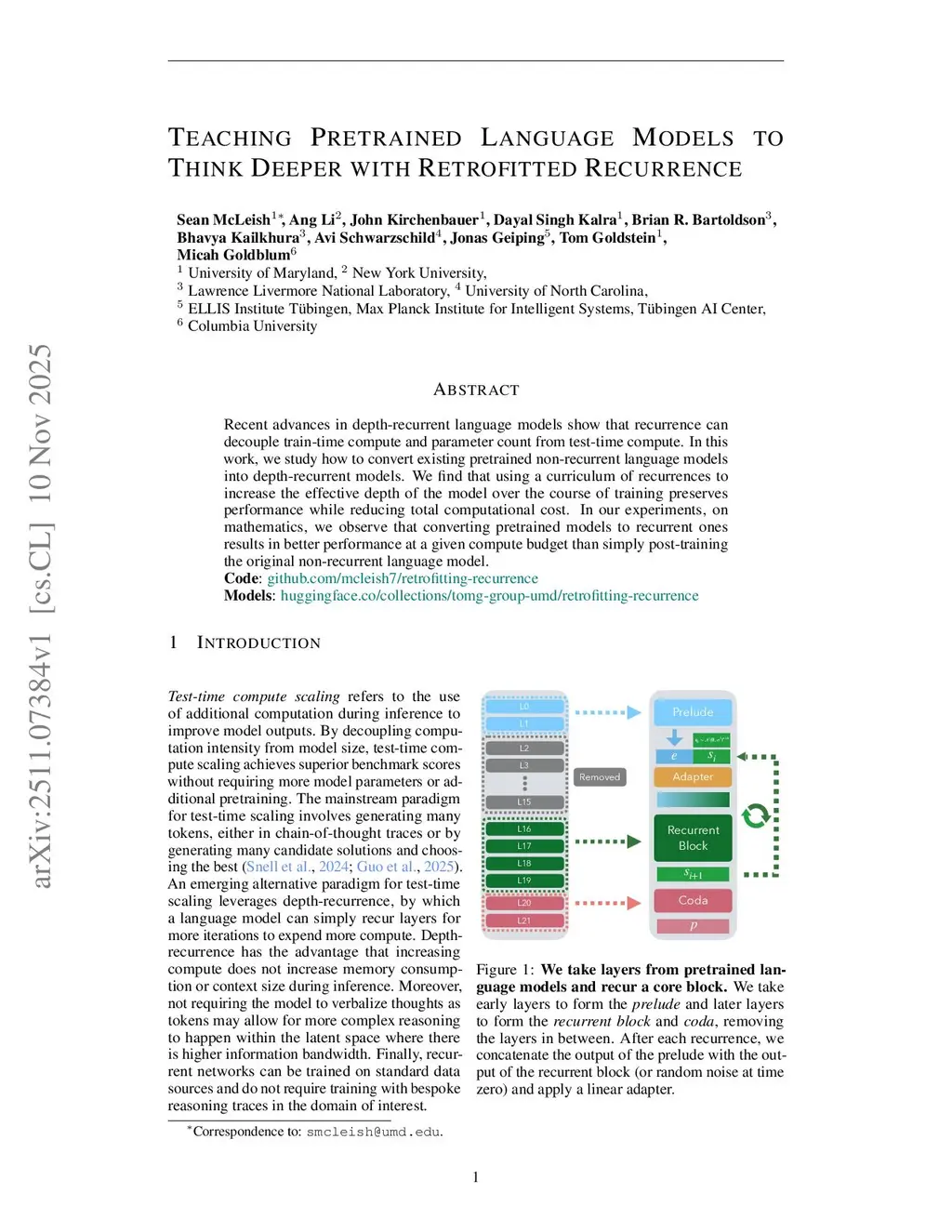 Recent advances in depth-recurrent language models show that recurrence can decouple train-time compute and parameter count from test-time compute. In this work, we study how to convert existing pretrained non-recurrent language models into depth-recurrent models. We find that using a curriculum of recurrences to increase the effective depth of the model over the course of training preserves performance while reducing total computational cost. In our experiments, on mathematics, we observe that converting pretrained models to recurrent ones results in better performance at a given compute budget than simply post-training the original non-recurrent language model.