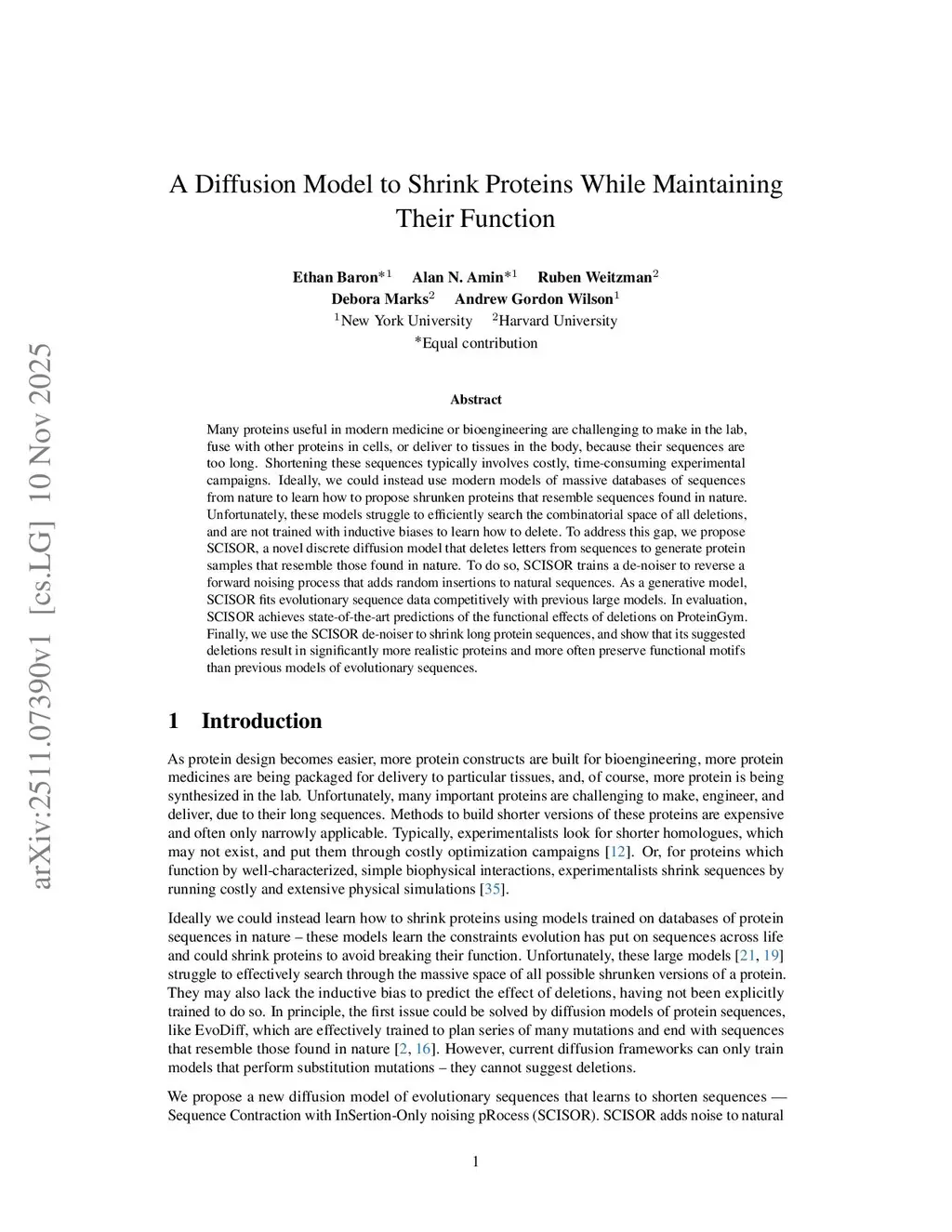 Many proteins useful in modern medicine or bioengineering are challenging to make in the lab, fuse with other proteins in cells, or deliver to tissues in the body, because their sequences are too long. Shortening these sequences typically involves costly, time-consuming experimental campaigns. Ideally, we could instead use modern models of massive databases of sequences from nature to learn how to propose shrunken proteins that resemble sequences found in nature. Unfortunately, these models struggle to efficiently search the combinatorial space of all deletions, and are not trained with inductive biases to learn how to delete. To address this gap, we propose SCISOR, a novel discrete diffusion model that deletes letters from sequences to generate protein samples that resemble those found in nature. To do so, SCISOR trains a de-noiser to reverse a forward noising process that adds random insertions to natural sequences. As a generative model, SCISOR fits evolutionary sequence data competitively with previous large models. In evaluation, SCISOR achieves state-of-the-art predictions of the functional effects of deletions on ProteinGym. Finally, we use the SCISOR de-noiser to shrink long protein sequences, and show that its suggested deletions result in significantly more realistic proteins and more often preserve functional motifs than previous models of evolutionary sequences.