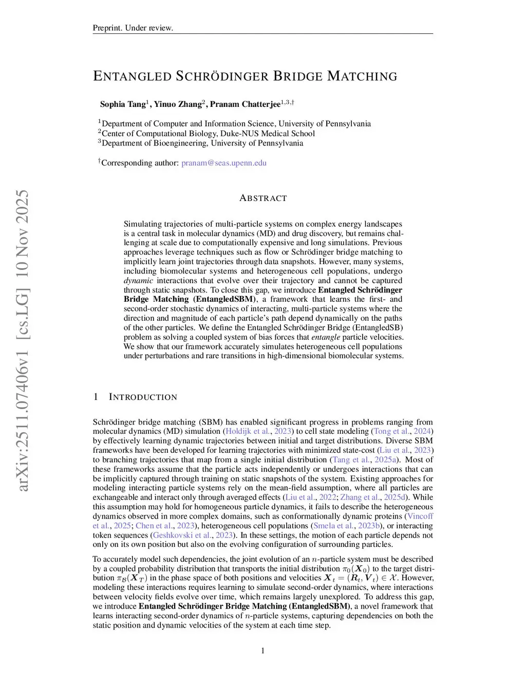 Simulating trajectories of multi-particle systems on complex energy landscapes is a central task in molecular dynamics (MD) and drug discovery, but remains challenging at scale due to computationally expensive and long simulations. Previous approaches leverage techniques such as flow or Schrödinger bridge matching to implicitly learn joint trajectories through data snapshots. However, many systems, including biomolecular systems and heterogeneous cell populations, undergo dynamic interactions that evolve over their trajectory and cannot be captured through static snapshots. To close this gap, we introduce Entangled Schrödinger Bridge Matching (EntangledSBM), a framework that learns the first- and second-order stochastic dynamics of interacting, multi-particle systems where the direction and magnitude of each particle's path depend dynamically on the paths of the other particles. We define the Entangled Schrödinger Bridge (EntangledSB) problem as solving a coupled system of bias forces that entangle particle velocities. We show that our framework accurately simulates heterogeneous cell populations under perturbations and rare transitions in high-dimensional biomolecular systems.
