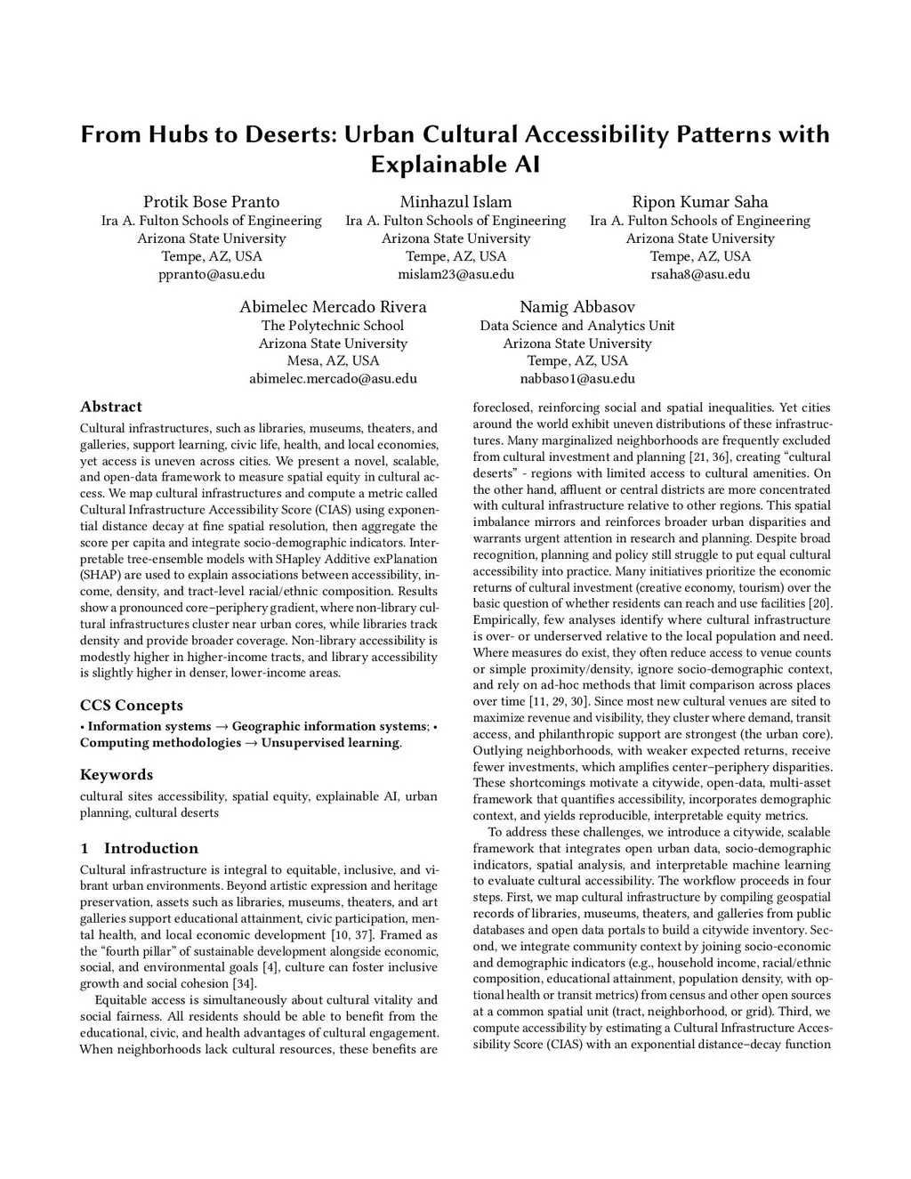 Cultural infrastructures, such as libraries, museums, theaters, and galleries, support learning, civic life, health, and local economies, yet access is uneven across cities. We present a novel, scalable, and open-data framework to measure spatial equity in cultural access. We map cultural infrastructures and compute a metric called Cultural Infrastructure Accessibility Score (CIAS) using exponential distance decay at fine spatial resolution, then aggregate the score per capita and integrate socio-demographic indicators. Interpretable tree-ensemble models with SHapley Additive exPlanation (SHAP) are used to explain associations between accessibility, income, density, and tract-level racial/ethnic composition. Results show a pronounced core-periphery gradient, where non-library cultural infrastructures cluster near urban cores, while libraries track density and provide broader coverage. Non-library accessibility is modestly higher in higher-income tracts, and library accessibility is slightly higher in denser, lower-income areas.