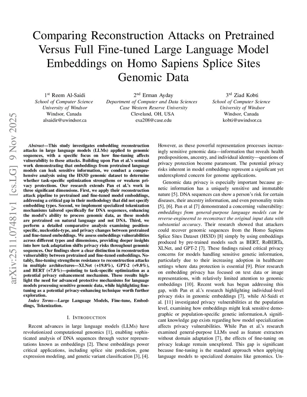 Comparing Reconstruction Attacks on Pretrained Versus Full Fine-tuned Large Language Model Embeddings on Homo Sapiens Splice Sites Genomic Data