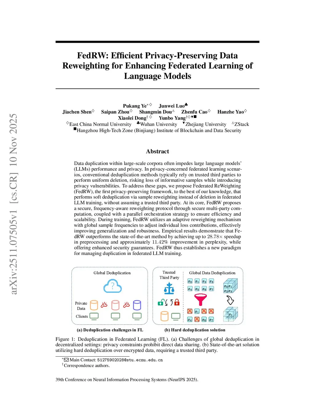 Data duplication within large-scale corpora often impedes large language models' (LLMs) performance and privacy. In privacy-concerned federated learning scenarios, conventional deduplication methods typically rely on trusted third parties to perform uniform deletion, risking loss of informative samples while introducing privacy vulnerabilities. To address these gaps, we propose Federated ReWeighting (FedRW), the first privacy-preserving framework, to the best of our knowledge, that performs soft deduplication via sample reweighting instead of deletion in federated LLM training, without assuming a trusted third party. At its core, FedRW proposes a secure, frequency-aware reweighting protocol through secure multi-party computation, coupled with a parallel orchestration strategy to ensure efficiency and scalability. During training, FedRW utilizes an adaptive reweighting mechanism with global sample frequencies to adjust individual loss contributions, effectively improving generalization and robustness. Empirical results demonstrate that FedRW outperforms the state-of-the-art method by achieving up to 28.78x speedup in preprocessing and approximately 11.42% improvement in perplexity, while offering enhanced security guarantees. FedRW thus establishes a new paradigm for managing duplication in federated LLM training.