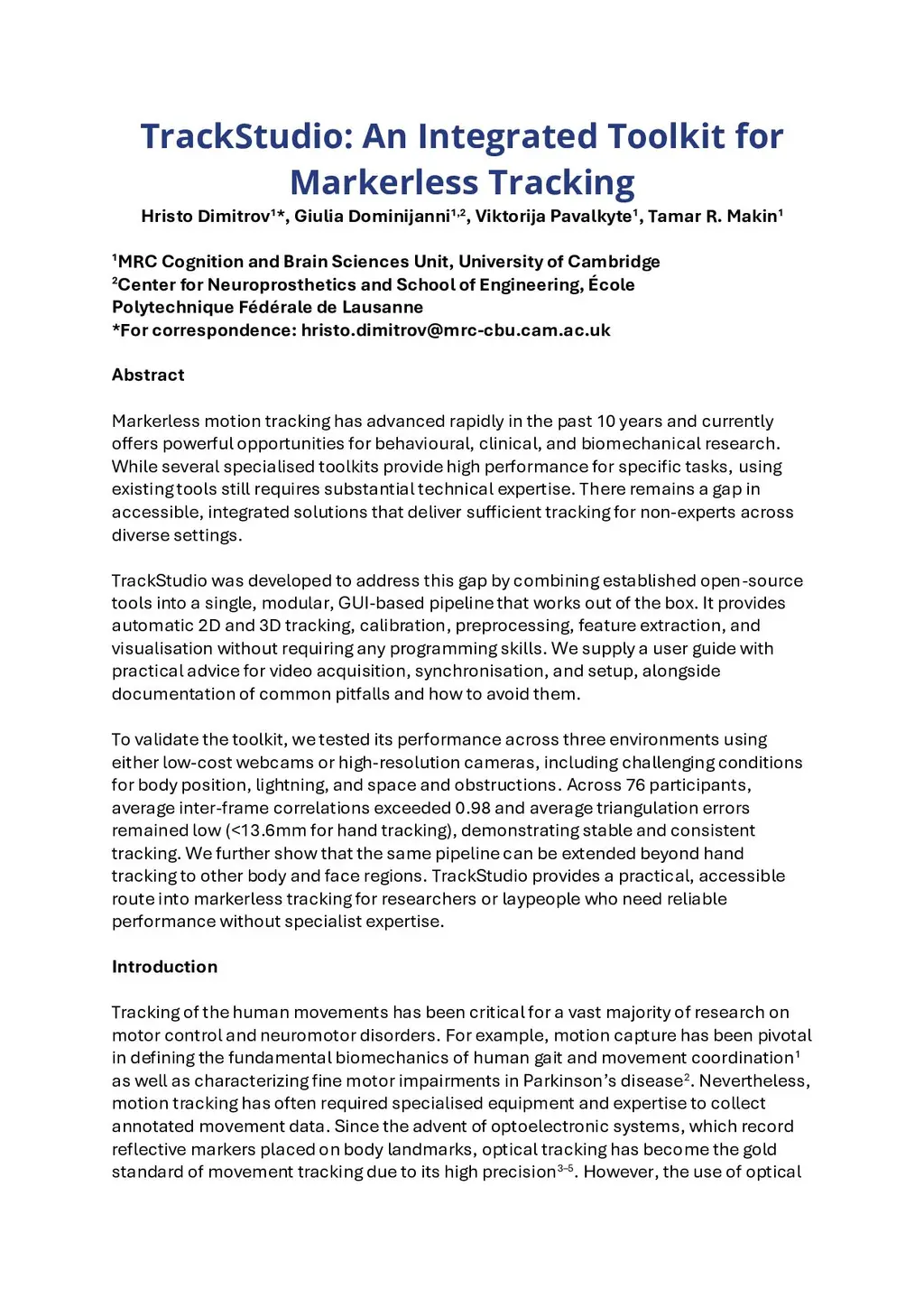Markerless motion tracking has advanced rapidly in the past 10 years and currently offers powerful opportunities for behavioural, clinical, and biomechanical research. While several specialised toolkits provide high performance for specific tasks, using existing tools still requires substantial technical expertise. There remains a gap in accessible, integrated solutions that deliver sufficient tracking for non-experts across diverse settings.TrackStudio was developed to address this gap by combining established open-source tools into a single, modular, GUI-based pipeline that works out of the box. It provides automatic 2D and 3D tracking, calibration, preprocessing, feature extraction, and visualisation without requiring any programming skills. We supply a user guide with practical advice for video acquisition, synchronisation, and setup, alongside documentation of common pitfalls and how to avoid them.To validate the toolkit, we tested its performance across three environments using either low-cost webcams or high-resolution cameras, including challenging conditions for body position, lightning, and space and obstructions. Across 76 participants, average inter-frame correlations exceeded 0.98 and average triangulation errors remained low (<13.6mm for hand tracking), demonstrating stable and consistent tracking. We further show that the same pipeline can be extended beyond hand tracking to other body and face regions. TrackStudio provides a practical, accessible route into markerless tracking for researchers or laypeople who need reliable performance without specialist expertise.