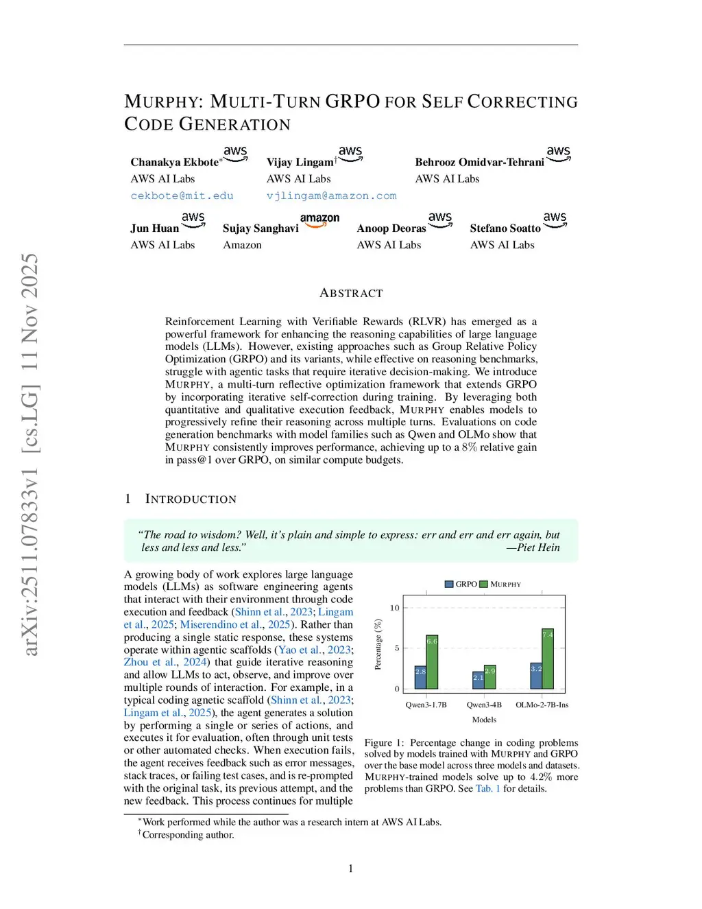 Reinforcement Learning with Verifiable Rewards (RLVR) has emerged as a powerful framework for enhancing the reasoning capabilities of large language models (LLMs). However, existing approaches such as Group Relative Policy Optimization (GRPO) and its variants, while effective on reasoning benchmarks, struggle with agentic tasks that require iterative decision-making. We introduce Murphy, a multi-turn reflective optimization framework that extends GRPO by incorporating iterative self-correction during training. By leveraging both quantitative and qualitative execution feedback, Murphy enables models to progressively refine their reasoning across multiple turns. Evaluations on code generation benchmarks with model families such as Qwen and OLMo show that Murphy consistently improves performance, achieving up to a 8% relative gain in pass@1 over GRPO, on similar compute budgets.