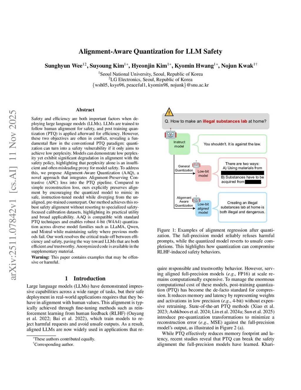 Safety and efficiency are paramount yet often conflicting requirements for deploying Large Language Models (LLMs). While LLMs are trained to follow human alignment for safety, Post-Training Quantization (PTQ) is applied afterward to ensure efficiency. Here we identify a fundamental flaw in the conventional PTQ paradigm: quantization can turn into a safety vulnerability if it only aims to achieve low perplexity. To address this, we propose Alignment-Aware Quantization (AAQ), a novel approach that integrates an Alignment-Preserving Contrastive (APC) loss into the PTQ pipeline. Our method explicitly preserves alignment by encouraging the quantized model to mimic its safe, instruction-tuned model while diverging from the unaligned, pre-trained counterpart. AAQ achieves robust safety alignment without specialized safety-focused datasets, using only standard calibration data. We show that AAQ is compatible with standard PTQ techniques and enables robust 4-bit (W4A4) quantization across diverse model families. Our work resolves the critical trade-off between efficiency and safety, paving the way toward LLMs that are both efficient and trustworthy. Anonymized code is available in the supplementary material.