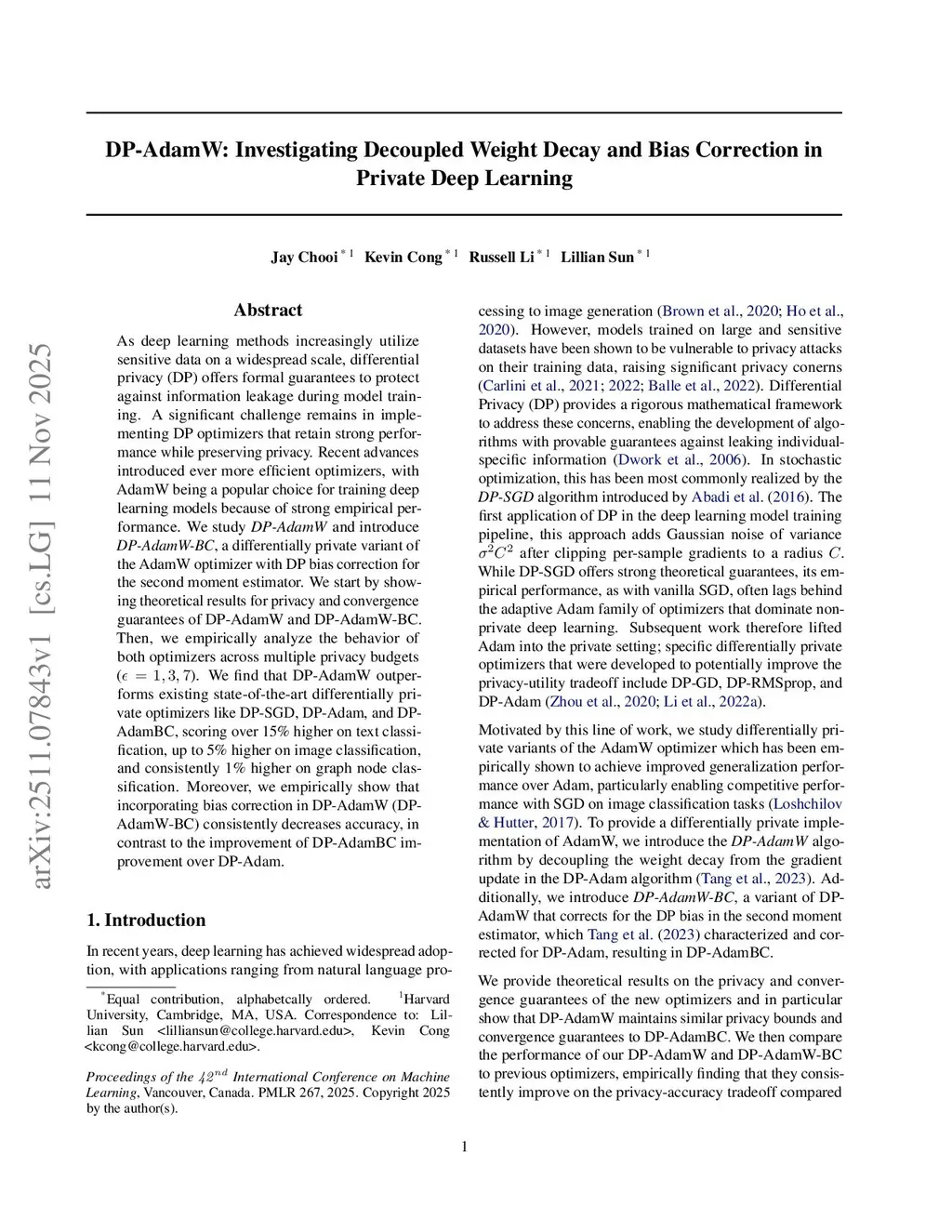 As deep learning methods increasingly utilize sensitive data on a widespread scale, differential privacy (DP) offers formal guarantees to protect against information leakage during model training. A significant challenge remains in implementing DP optimizers that retain strong performance while preserving privacy. Recent advances introduced ever more efficient optimizers, with AdamW being a popular choice for training deep learning models because of strong empirical performance. We study \emph{DP-AdamW} and introduce \emph{DP-AdamW-BC}, a differentially private variant of the AdamW optimizer with DP bias correction for the second moment estimator. We start by showing theoretical results for privacy and convergence guarantees of DP-AdamW and DP-AdamW-BC. Then, we empirically analyze the behavior of both optimizers across multiple privacy budgets (). We find that DP-AdamW outperforms existing state-of-the-art differentially private optimizers like DP-SGD, DP-Adam, and DP-AdamBC, scoring over 15\% higher on text classification, up to 5\% higher on image classification, and consistently 1\% higher on graph node classification. Moreover, we empirically show that incorporating bias correction in DP-AdamW (DP-AdamW-BC) consistently decreases accuracy, in contrast to the improvement of DP-AdamBC improvement over DP-Adam.