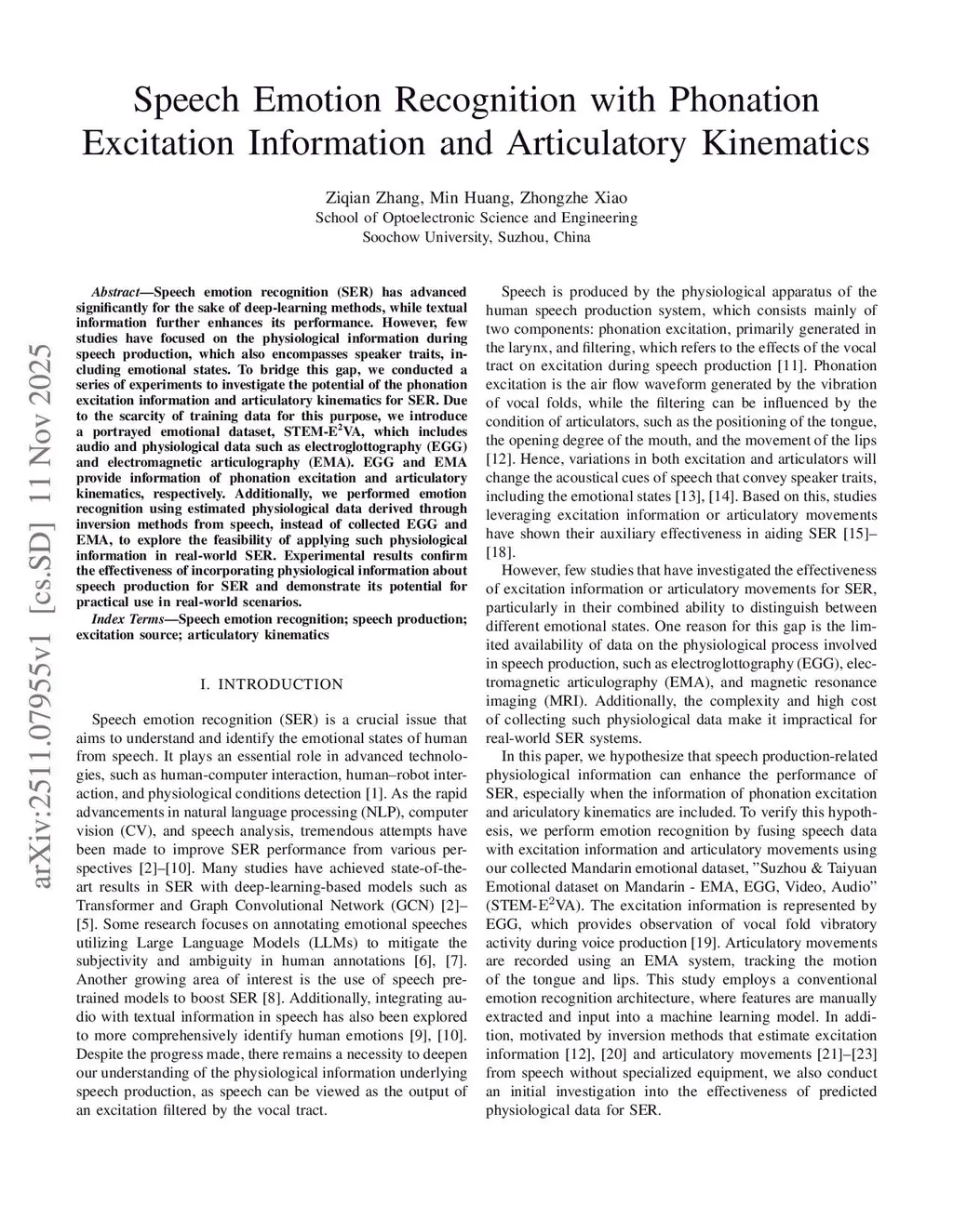 Speech Emotion Recognition with Phonation Excitation Information and Articulatory Kinematics