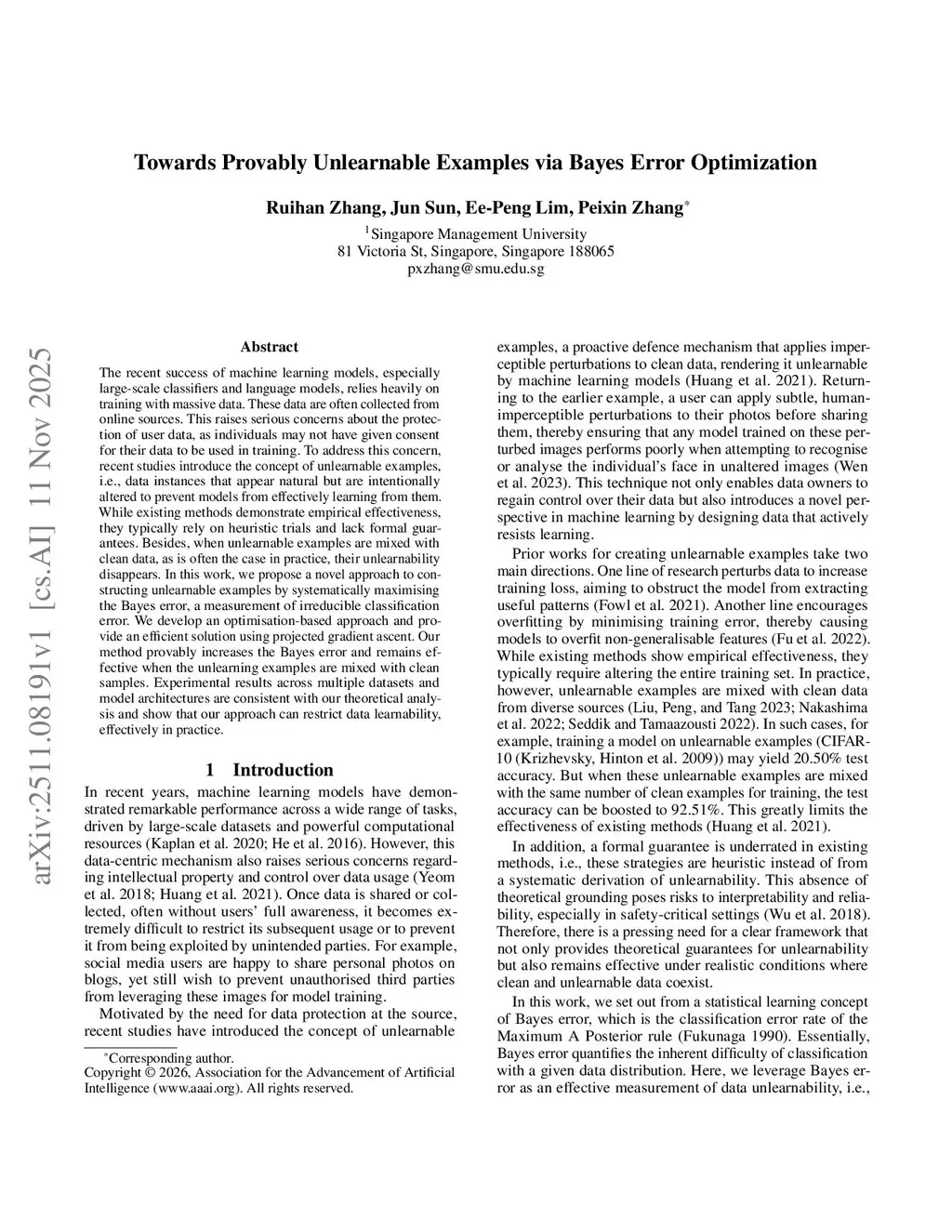 The recent success of machine learning models, especially large-scale classifiers and language models, relies heavily on training with massive data. These data are often collected from online sources. This raises serious concerns about the protection of user data, as individuals may not have given consent for their data to be used in training. To address this concern, recent studies introduce the concept of unlearnable examples, i.e., data instances that appear natural but are intentionally altered to prevent models from effectively learning from them. While existing methods demonstrate empirical effectiveness, they typically rely on heuristic trials and lack formal guarantees. Besides, when unlearnable examples are mixed with clean data, as is often the case in practice, their unlearnability disappears. In this work, we propose a novel approach to constructing unlearnable examples by systematically maximising the Bayes error, a measurement of irreducible classification error. We develop an optimisation-based approach and provide an efficient solution using projected gradient ascent. Our method provably increases the Bayes error and remains effective when the unlearning examples are mixed with clean samples. Experimental results across multiple datasets and model architectures are consistent with our theoretical analysis and show that our approach can restrict data learnability, effectively in practice.