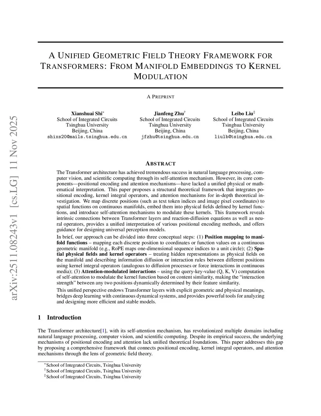 The Transformer architecture has achieved tremendous success in natural language processing, computer vision, and scientific computing through its self-attention mechanism. However, its core components-positional encoding and attention mechanisms-have lacked a unified physical or mathematical interpretation. This paper proposes a structural theoretical framework that integrates positional encoding, kernel integral operators, and attention mechanisms for in-depth theoretical investigation. We map discrete positions (such as text token indices and image pixel coordinates) to spatial functions on continuous manifolds, enabling a field-theoretic interpretation of Transformer layers as kernel-modulated operators acting over embedded manifolds.