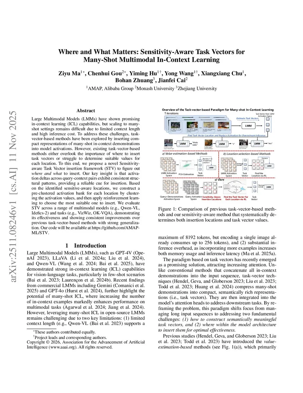 Large Multimodal Models (LMMs) have shown promising in-context learning (ICL) capabilities, but scaling to many-shot settings remains difficult due to limited context length and high inference cost. To address these challenges, task-vector-based methods have been explored by inserting compact representations of many-shot in-context demonstrations into model activations. However, existing task-vector-based methods either overlook the importance of where to insert task vectors or struggle to determine suitable values for each location. To this end, we propose a novel Sensitivity-aware Task Vector insertion framework (STV) to figure out where and what to insert. Our key insight is that activation deltas across query-context pairs exhibit consistent structural patterns, providing a reliable cue for insertion. Based on the identified sensitive-aware locations, we construct a pre-clustered activation bank for each location by clustering the activation values, and then apply reinforcement learning to choose the most suitable one to insert. We evaluate STV across a range of multimodal models (e.g., Qwen-VL, Idefics-2) and tasks (e.g., VizWiz, OK-VQA), demonstrating its effectiveness and showing consistent improvements over previous task-vector-based methods with strong generalization.