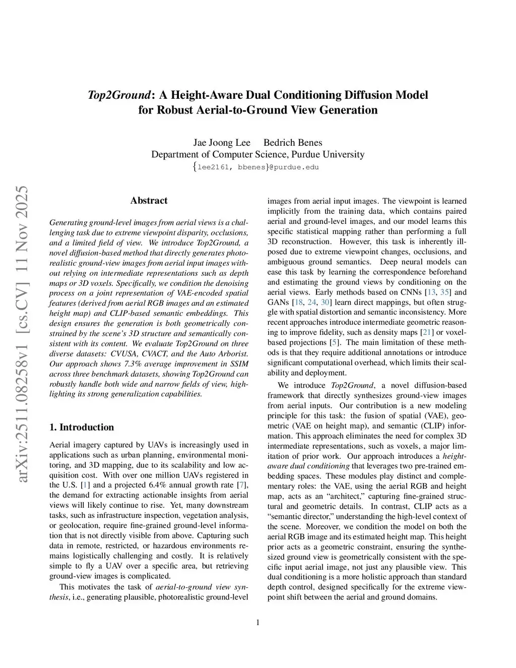 Generating ground-level images from aerial views is a challenging task due to extreme viewpoint disparity, occlusions, and a limited field of view. We introduce Top2Ground, a novel diffusion-based method that directly generates photorealistic ground-view images from aerial input images without relying on intermediate representations such as depth maps or 3D voxels. Specifically, we condition the denoising process on a joint representation of VAE-encoded spatial features (derived from aerial RGB images and an estimated height map) and CLIP-based semantic embeddings. This design ensures the generation is both geometrically constrained by the scene's 3D structure and semantically consistent with its content. We evaluate Top2Ground on three diverse datasets: CVUSA, CVACT, and the Auto Arborist. Our approach shows 7.3% average improvement in SSIM across three benchmark datasets, showing Top2Ground can robustly handle both wide and narrow fields of view, highlighting its strong generalization capabilities.