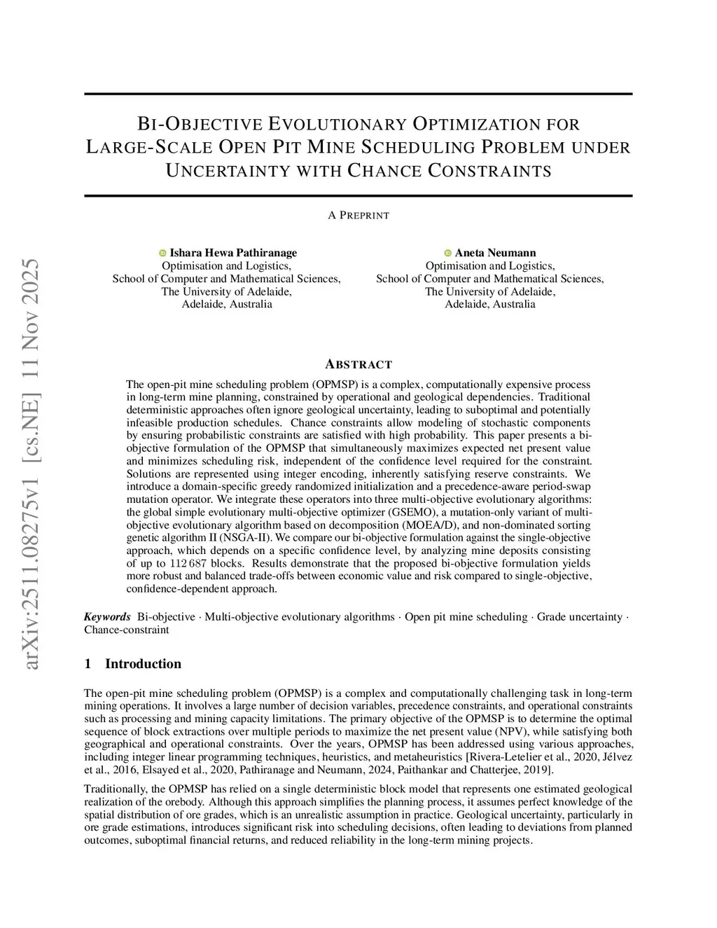 Bi-Objective Evolutionary Optimization for Large-Scale Open Pit Mine Scheduling Problem under Uncertainty with Chance Constraints