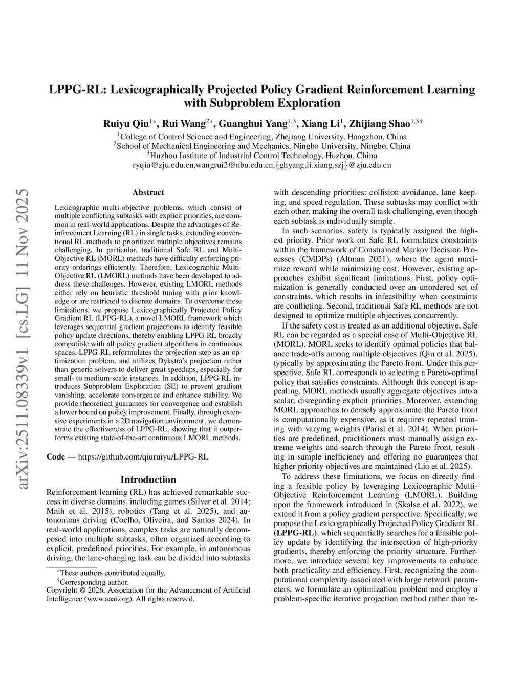 LPPG-RL: Lexicographically Projected Policy Gradient Reinforcement Learning with Subproblem Exploration