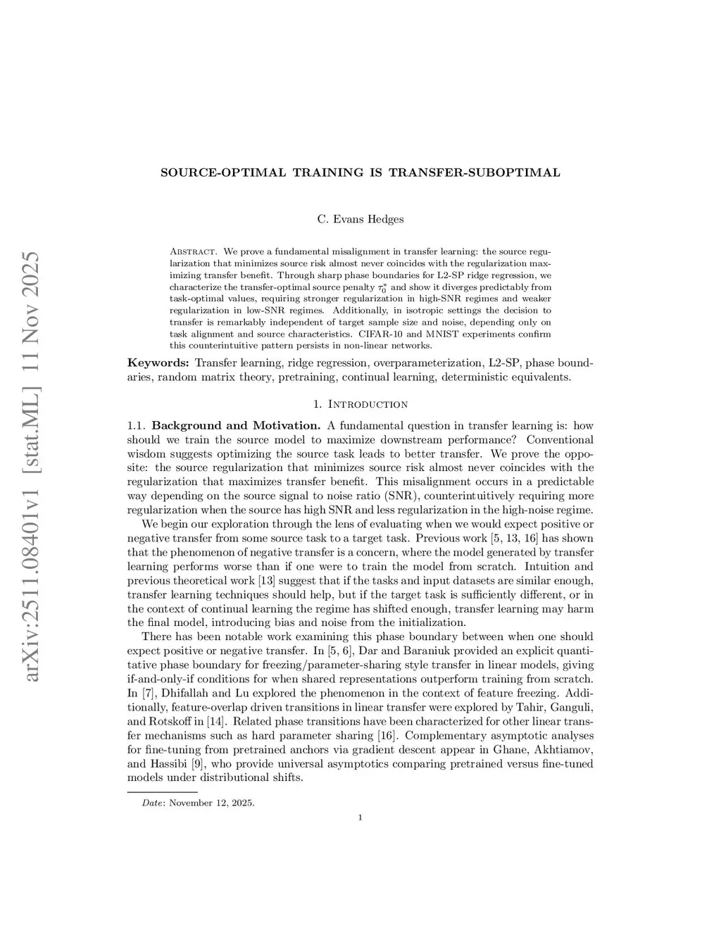 We prove a fundamental misalignment in transfer learning: the source regularization that minimizes source risk almost never coincides with the regularization maximizing transfer benefit. Through sharp phase boundaries for L2-SP ridge regression, we characterize the transfer-optimal source penalty for a fixed task alignment. With sufficiently weak alignment, is always larger than the source optimal regularization, however with strong alignment diverges predictably from task-optimal values: requiring stronger regularization in high-SNR regimes and weaker regularization in low-SNR regimes. Additionally, in isotropic settings the decision to transfer is remarkably independent of target sample size and noise, depending only on task alignment and source characteristics. CIFAR-10 and MNIST experiments confirm this counterintuitive pattern persists in non-linear networks.