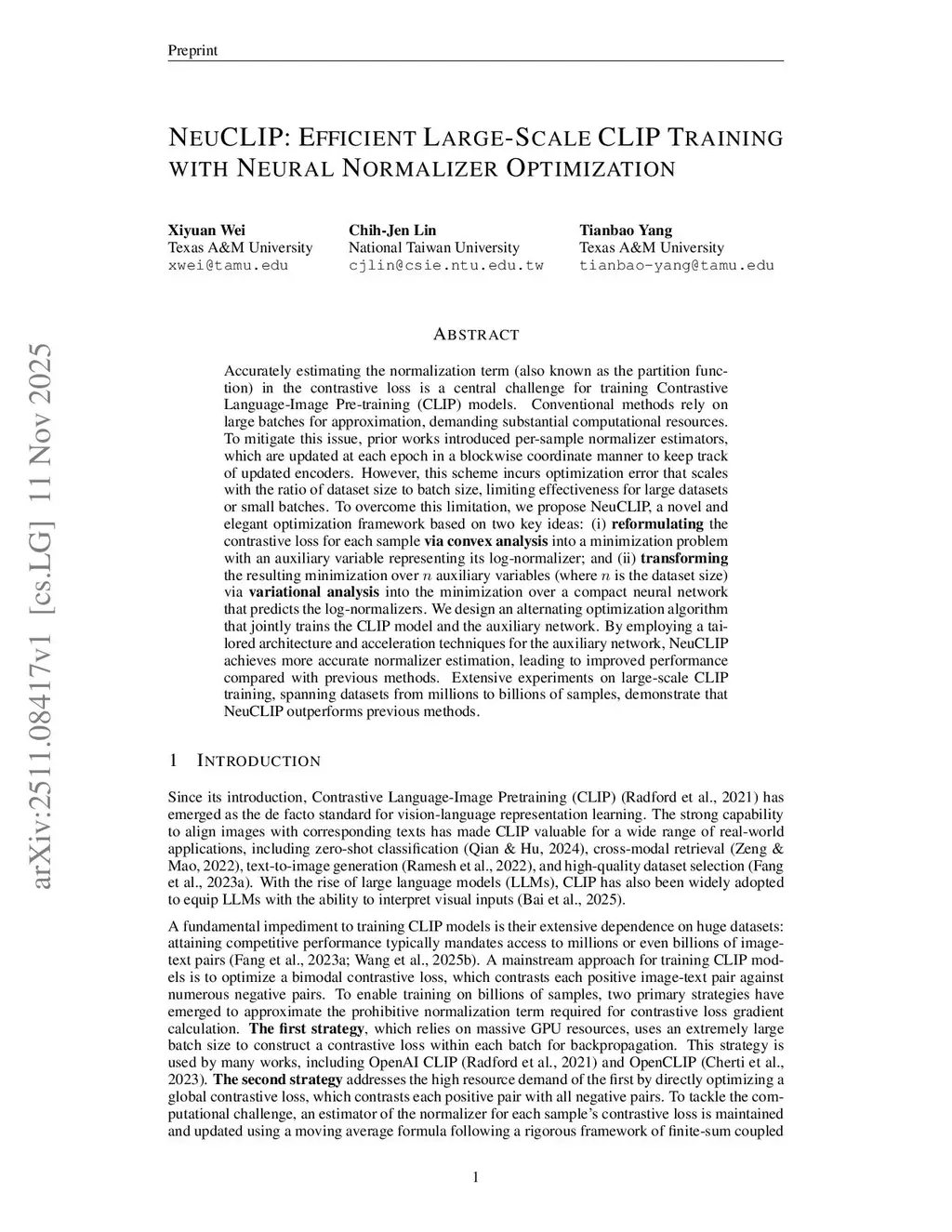 Accurately estimating the normalization term (also known as the partition function) in the contrastive loss is a central challenge for training Contrastive Language-Image Pre-training (CLIP) models. Conventional methods rely on large batches for approximation, demanding substantial computational resources. To mitigate this issue, prior works introduced per-sample normalizer estimators, which are updated at each epoch in a blockwise coordinate manner to keep track of updated encoders. However, this scheme incurs optimization error that scales with the ratio of dataset size to batch size, limiting effectiveness for large datasets or small batches. To overcome this limitation, we propose NeuCLIP, a novel and elegant optimization framework based on two key ideas: (i) the contrastive loss for each sample into a minimization problem with an auxiliary variable representing its log-normalizer; and (ii) the resulting minimization over auxiliary variables (where is the dataset size) via into the minimization over a compact neural network that predicts the log-normalizers. We design an alternating optimization algorithm that jointly trains the CLIP model and the auxiliary network. By employing a tailored architecture and acceleration techniques for the auxiliary network, NeuCLIP achieves more accurate normalizer estimation, leading to improved performance compared with previous methods. Extensive experiments on large-scale CLIP training, spanning datasets from millions to billions of samples, demonstrate that NeuCLIP outperforms previous methods.