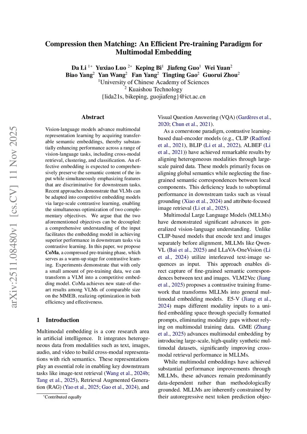 Compression then Matching: An Efficient Pre-training Paradigm for Multimodal Embedding