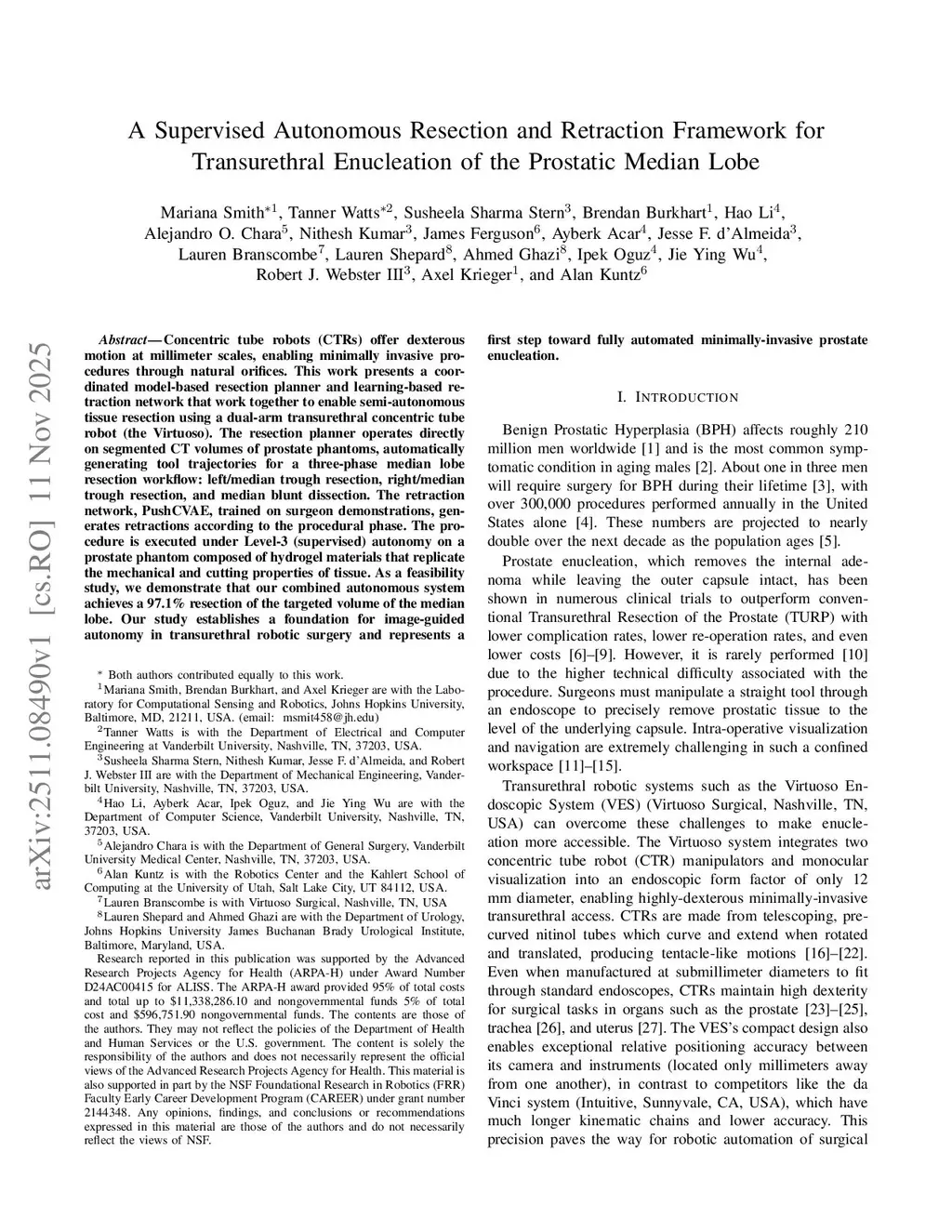 Concentric tube robots (CTRs) offer dexterous motion at millimeter scales, enabling minimally invasive procedures through natural orifices. This work presents a coordinated model-based resection planner and learning-based retraction network that work together to enable semi-autonomous tissue resection using a dual-arm transurethral concentric tube robot (the Virtuoso). The resection planner operates directly on segmented CT volumes of prostate phantoms, automatically generating tool trajectories for a three-phase median lobe resection workflow: left/median trough resection, right/median trough resection, and median blunt dissection. The retraction network, PushCVAE, trained on surgeon demonstrations, generates retractions according to the procedural phase. The procedure is executed under Level-3 (supervised) autonomy on a prostate phantom composed of hydrogel materials that replicate the mechanical and cutting properties of tissue. As a feasibility study, we demonstrate that our combined autonomous system achieves a 97.1% resection of the targeted volume of the median lobe. Our study establishes a foundation for image-guided autonomy in transurethral robotic surgery and represents a first step toward fully automated minimally-invasive prostate enucleation.