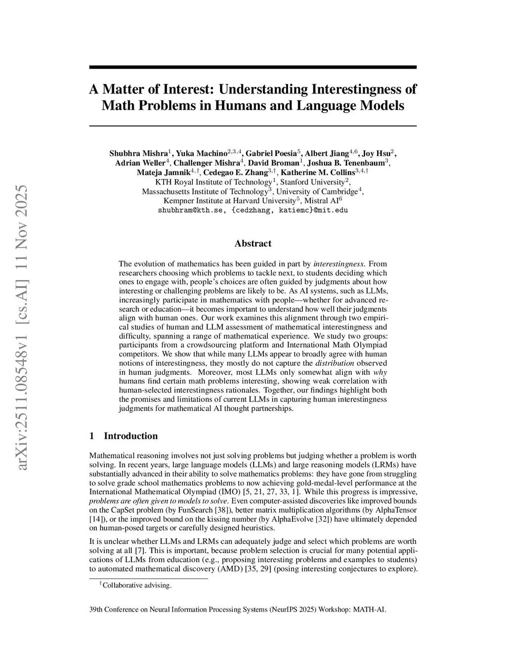 A Matter of Interest: Understanding Interestingness of Math Problems in Humans and Language Models